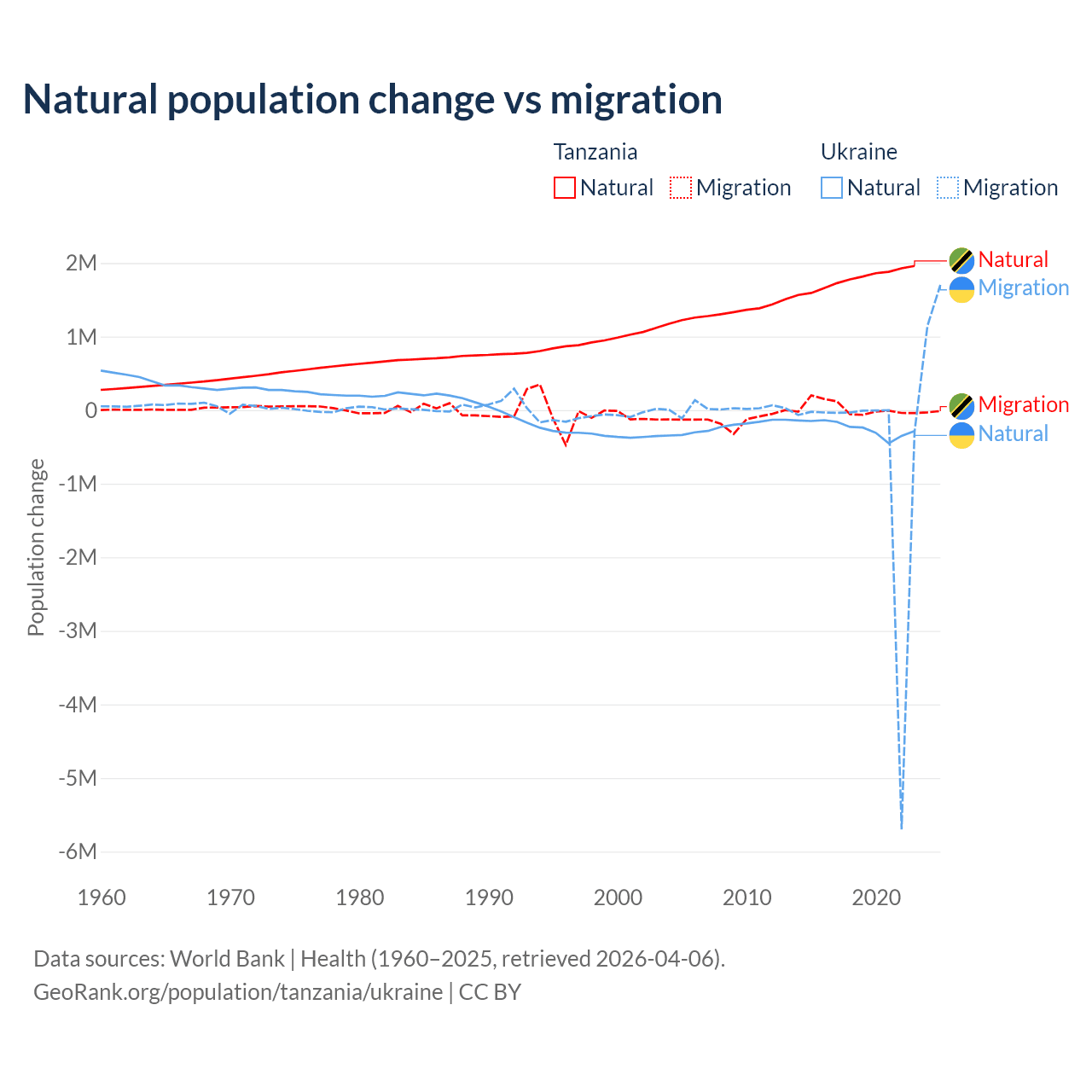 Over the last 10 years, 98.7% of the population change in Tanzania is from natural causes (a gain of 17,769,541 people) and 1.27% is from migration (a gain of 229,466 people). In Ukraine 28.2% is from natural causes (a loss of 2,435,153 people) and 71.8% is from migration (a loss of 6,198,995 people).