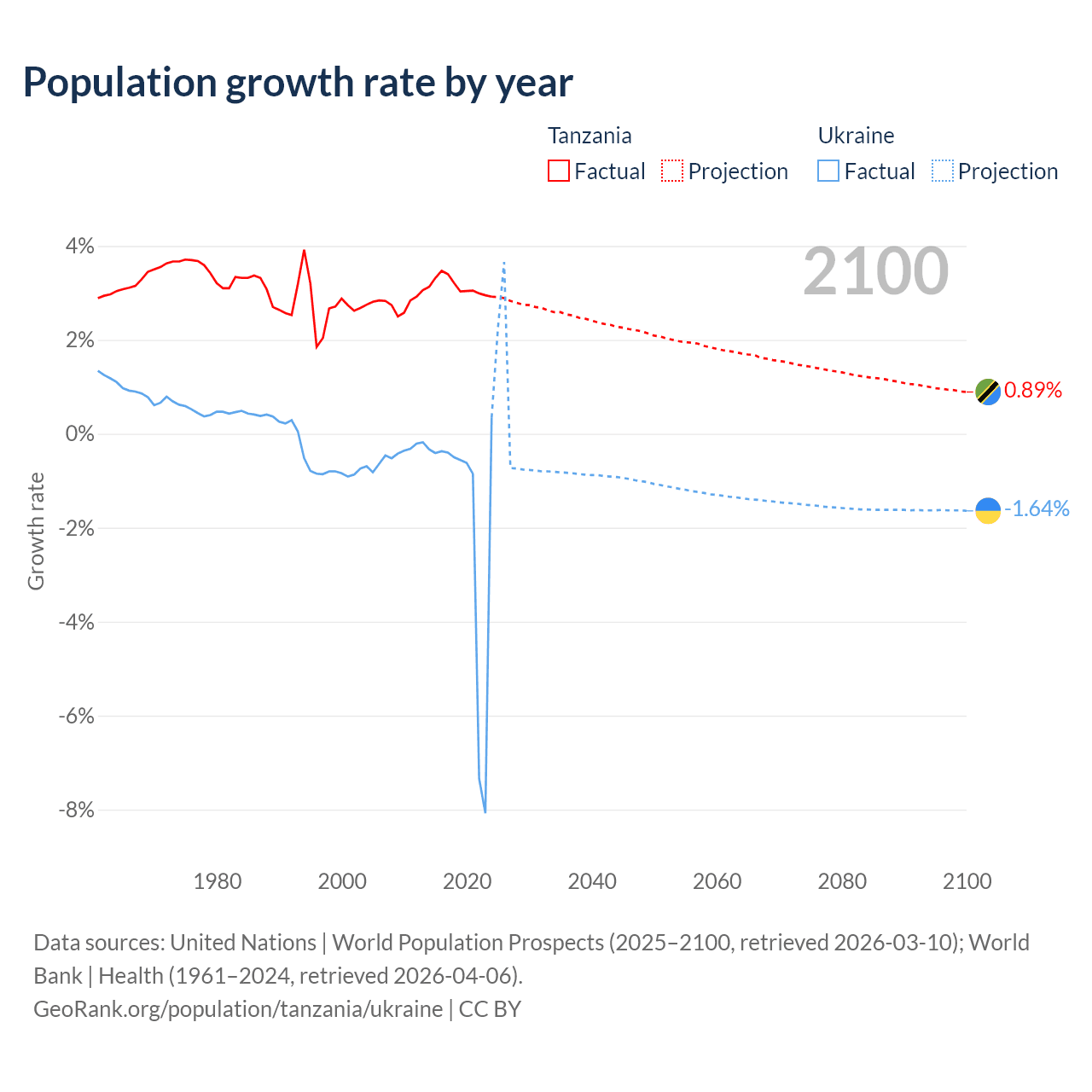 - For the last 10 years, Tanzania has had an average growth rate of +3.13% per year vs -1.74% in Ukraine.