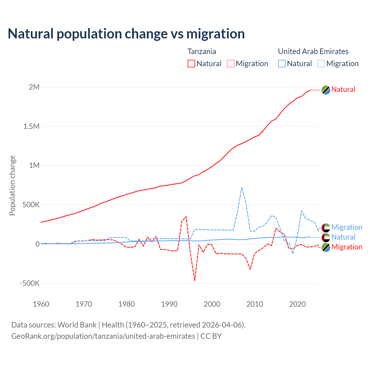 Over the last 10 years, 98.7% of the population change in Tanzania is from natural causes (a gain of 17,769,541 people) and 1.27% is from migration (a gain of 229,466 people). In the United Arab Emirates 30.5% is from natural causes (a gain of 857,996 people) and 69.5% is from migration (a gain of 1,958,520 people).