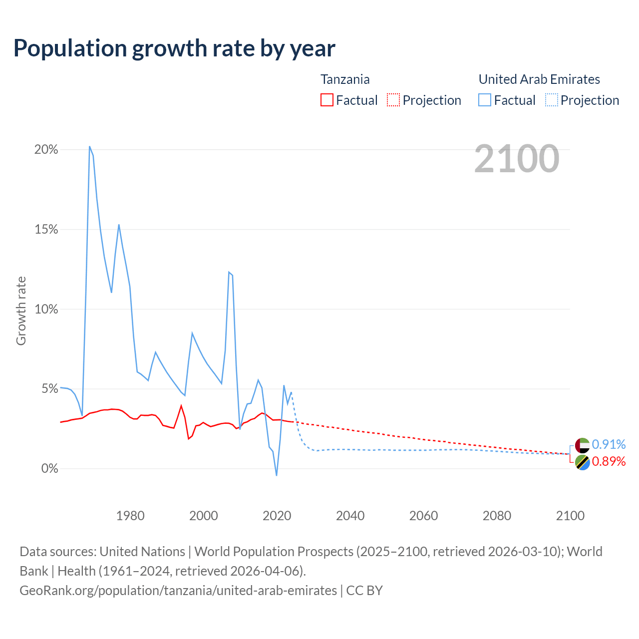 - For the last 10 years, Tanzania has had an average growth rate of +3.13% per year vs +3.31% in the United Arab Emirates.