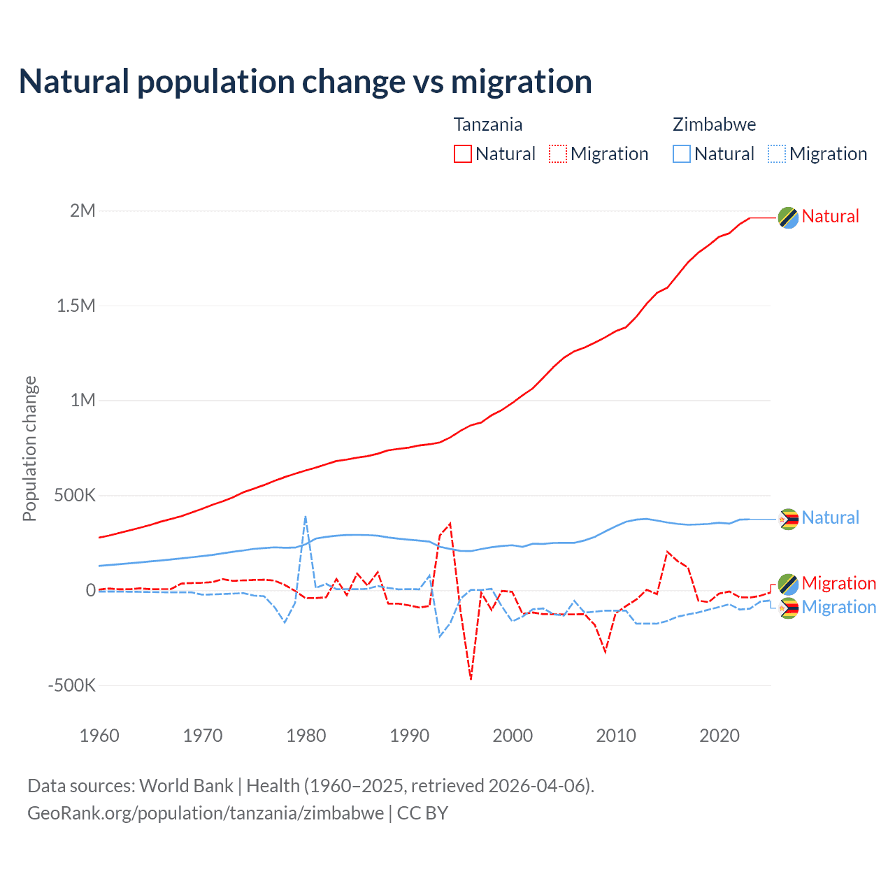 Over the last 10 years, 98.7% of the population change in Tanzania is from natural causes (a gain of 17,769,541 people) and 1.27% is from migration (a gain of 229,466 people). In Zimbabwe 74.9% is from natural causes (a gain of 3,558,487 people) and 25.1% is from migration (a loss of 1,192,807 people).