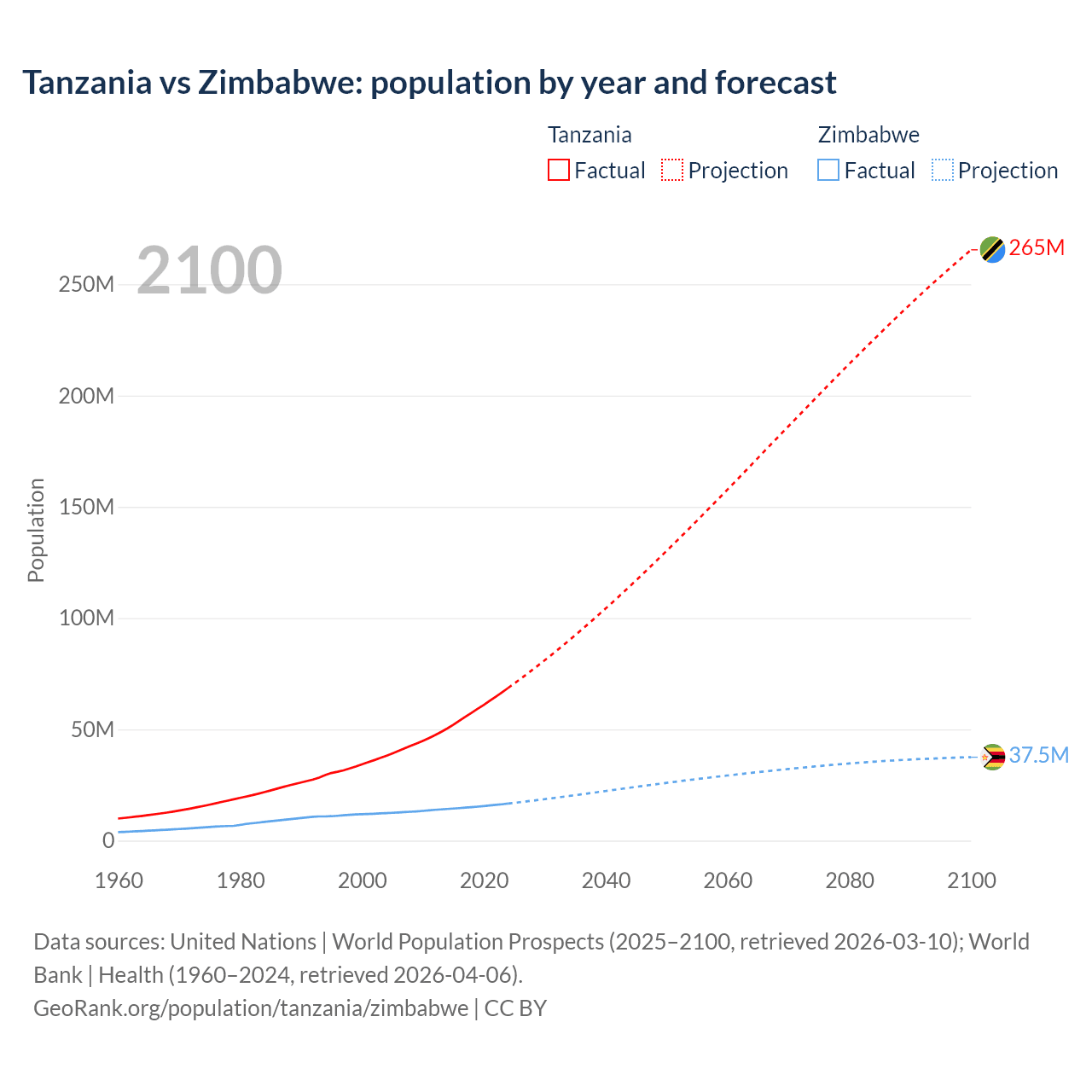 The latest officially reported population of Tanzania was 68,560,157 in 2024 vs 16,634,373 people in Zimbabwe in 2024. In 2026, based on the adjusted UN estimation, the current Tanzania's population is 73,145,892 people compared to 17,361,868 in Zimbabwe.