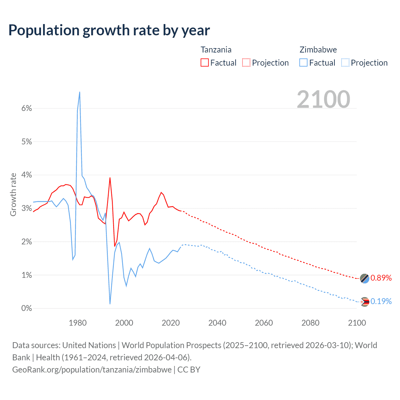 - For the last 10 years, Tanzania has had an average growth rate of +3.13% per year vs +1.57% in Zimbabwe.