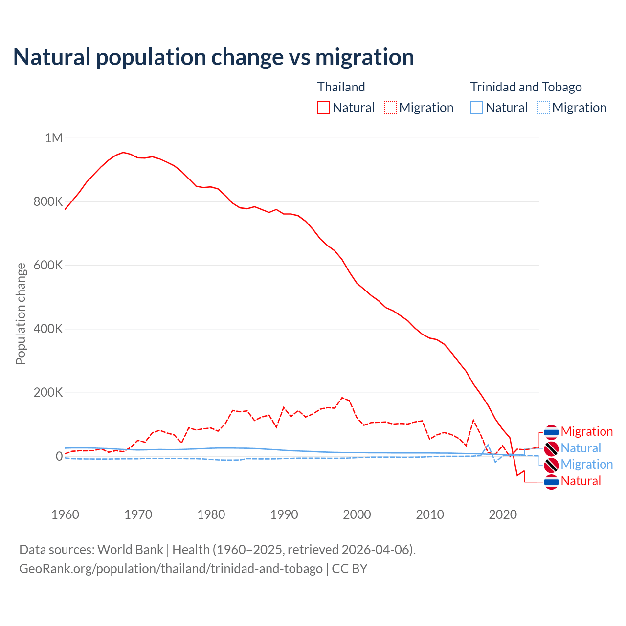 Over the last 10 years, 78.4% of the population change in Thailand is from natural causes (a gain of 1,292,528 people) and 21.6% is from migration (a gain of 355,361 people). In Trinidad and Tobago 66% is from natural causes (a gain of 55,887 people) and 34% is from migration (a gain of 28,785 people).