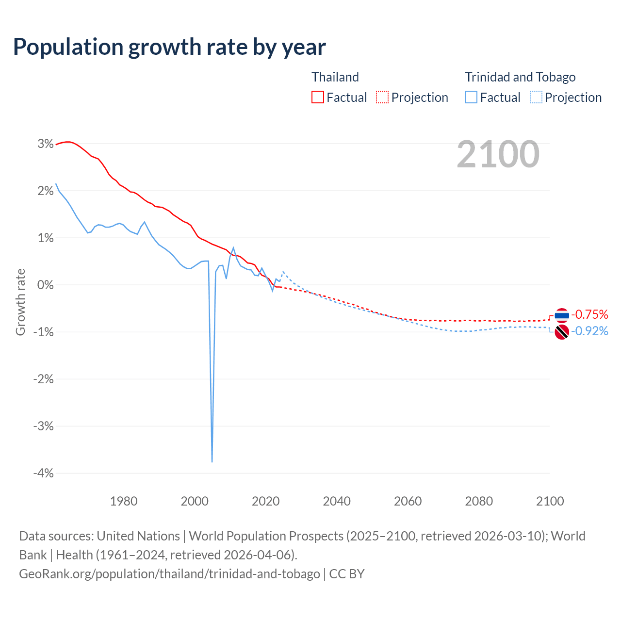 - For the last 10 years, Thailand has had an average growth rate of +0.23% per year vs +0.19% in Trinidad and Tobago.