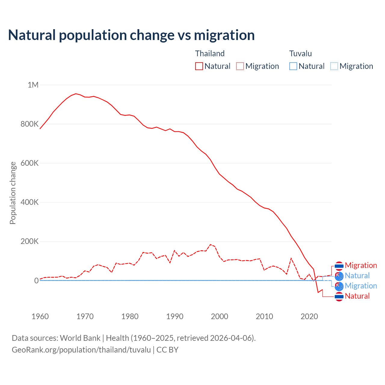 Over the last 10 years, 78.4% of the population change in Thailand is from natural causes (a gain of 1,292,528 people) and 21.6% is from migration (a gain of 355,361 people). In Tuvalu 35.5% is from natural causes (a gain of 1,556 people) and 64.5% is from migration (a loss of 2,827 people).