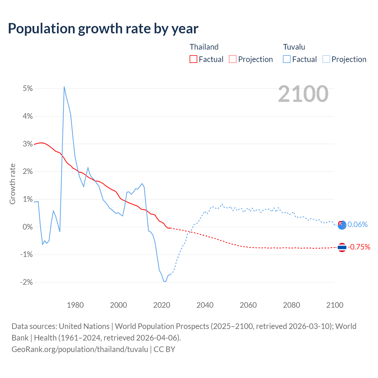 - For the last 10 years, Thailand has had an average growth rate of +0.23% per year vs -1.19% in Tuvalu.