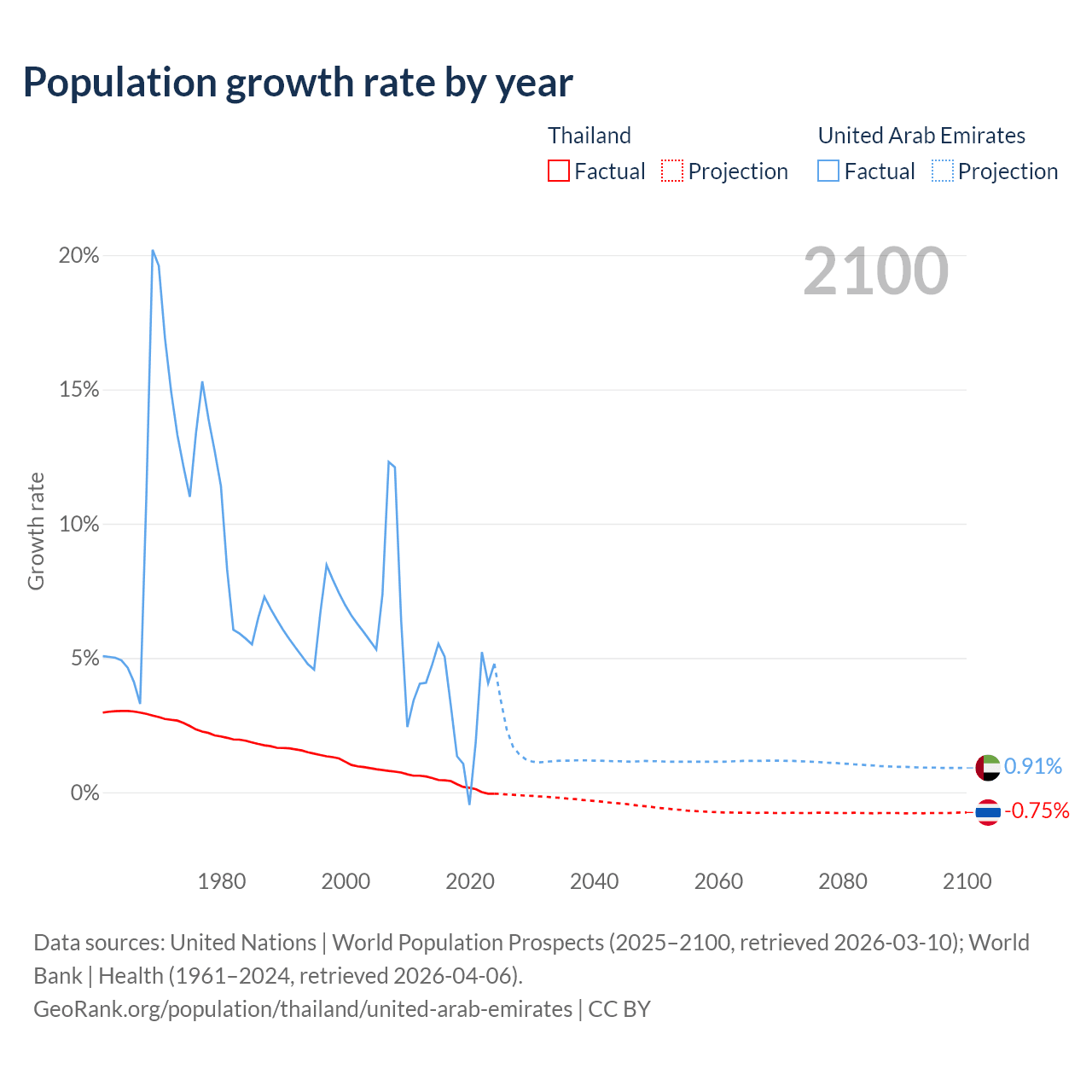 - For the last 10 years, Thailand has had an average growth rate of +0.23% per year vs +3.31% in the United Arab Emirates.