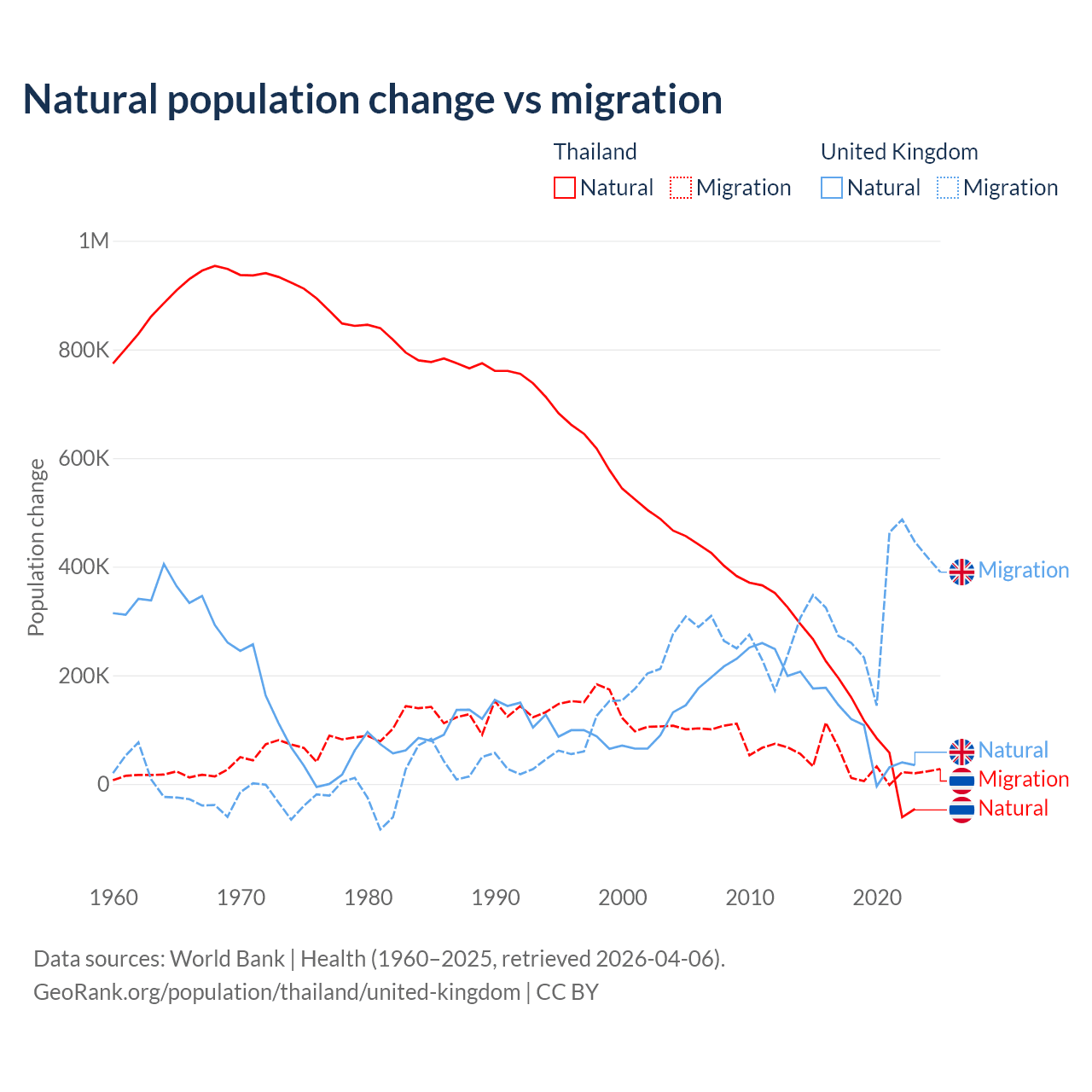 Over the last 10 years, 78.4% of the population change in Thailand is from natural causes (a gain of 1,292,528 people) and 21.6% is from migration (a gain of 355,361 people). In the United Kingdom 23.9% is from natural causes (a gain of 1,033,129 people) and 76.1% is from migration (a gain of 3,283,101 people).