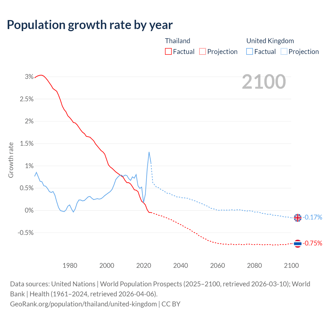 - For the last 10 years, Thailand has had an average growth rate of +0.23% per year vs +0.7% in the United Kingdom.