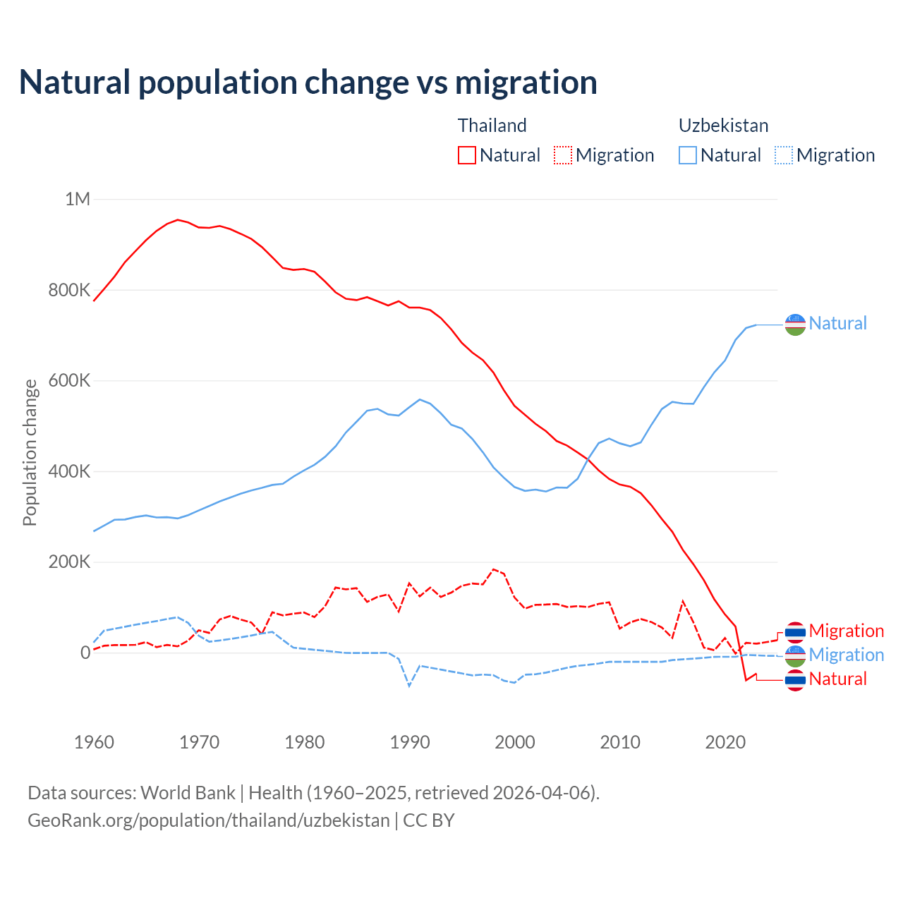Over the last 10 years, 78.4% of the population change in Thailand is from natural causes (a gain of 1,292,528 people) and 21.6% is from migration (a gain of 355,361 people). In Uzbekistan 98.2% is from natural causes (a gain of 6,161,117 people) and 1.84% is from migration (a loss of 115,398 people).