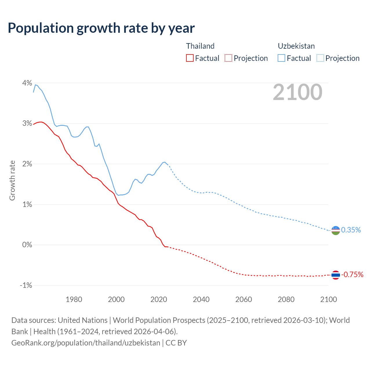 - For the last 10 years, Thailand has had an average growth rate of +0.23% per year vs +1.85% in Uzbekistan.