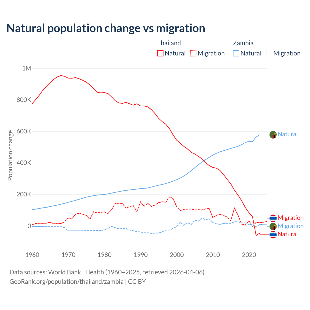Over the last 10 years, 78.4% of the population change in Thailand is from natural causes (a gain of 1,292,528 people) and 21.6% is from migration (a gain of 355,361 people). In Zambia 97.4% is from natural causes (a gain of 5,233,797 people) and 2.58% is from migration (a gain of 138,554 people).