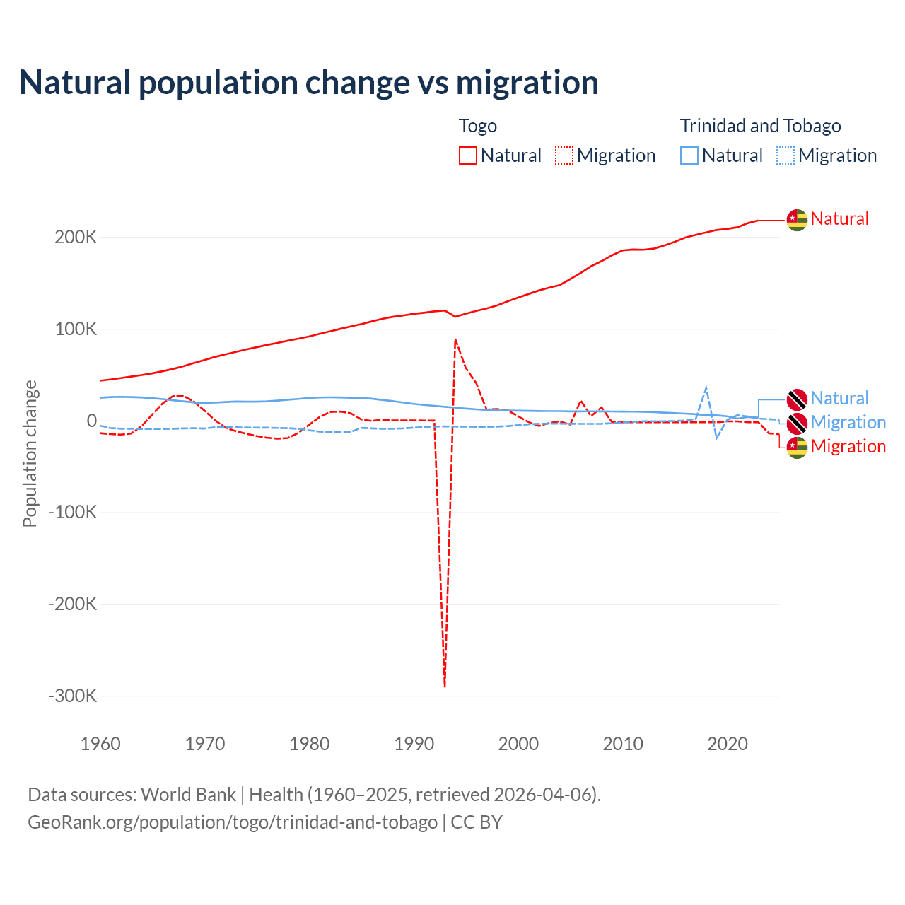 Over the last 10 years, 99.1% of the population change in Togo is from natural causes (a gain of 2,052,115 people) and 0.86% is from migration (a loss of 17,852 people). In Trinidad and Tobago 66% is from natural causes (a gain of 55,887 people) and 34% is from migration (a gain of 28,785 people).