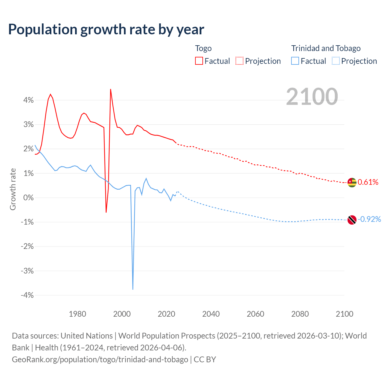 - For the last 10 years, Togo has had an average growth rate of +2.46% per year vs +0.19% in Trinidad and Tobago.