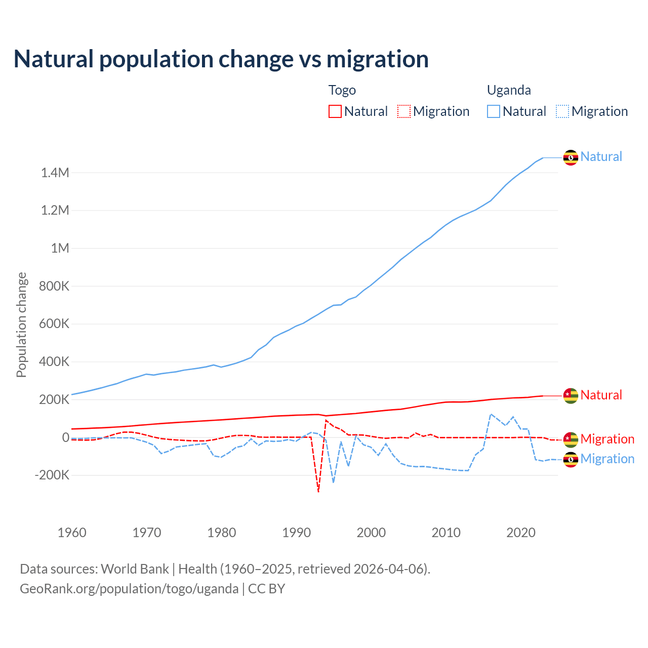 Over the last 10 years, 99.1% of the population change in Togo is from natural causes (a gain of 2,052,115 people) and 0.86% is from migration (a loss of 17,852 people). In Uganda 99.5% is from natural causes (a gain of 13,419,712 people) and 0.53% is from migration (a gain of 71,457 people).