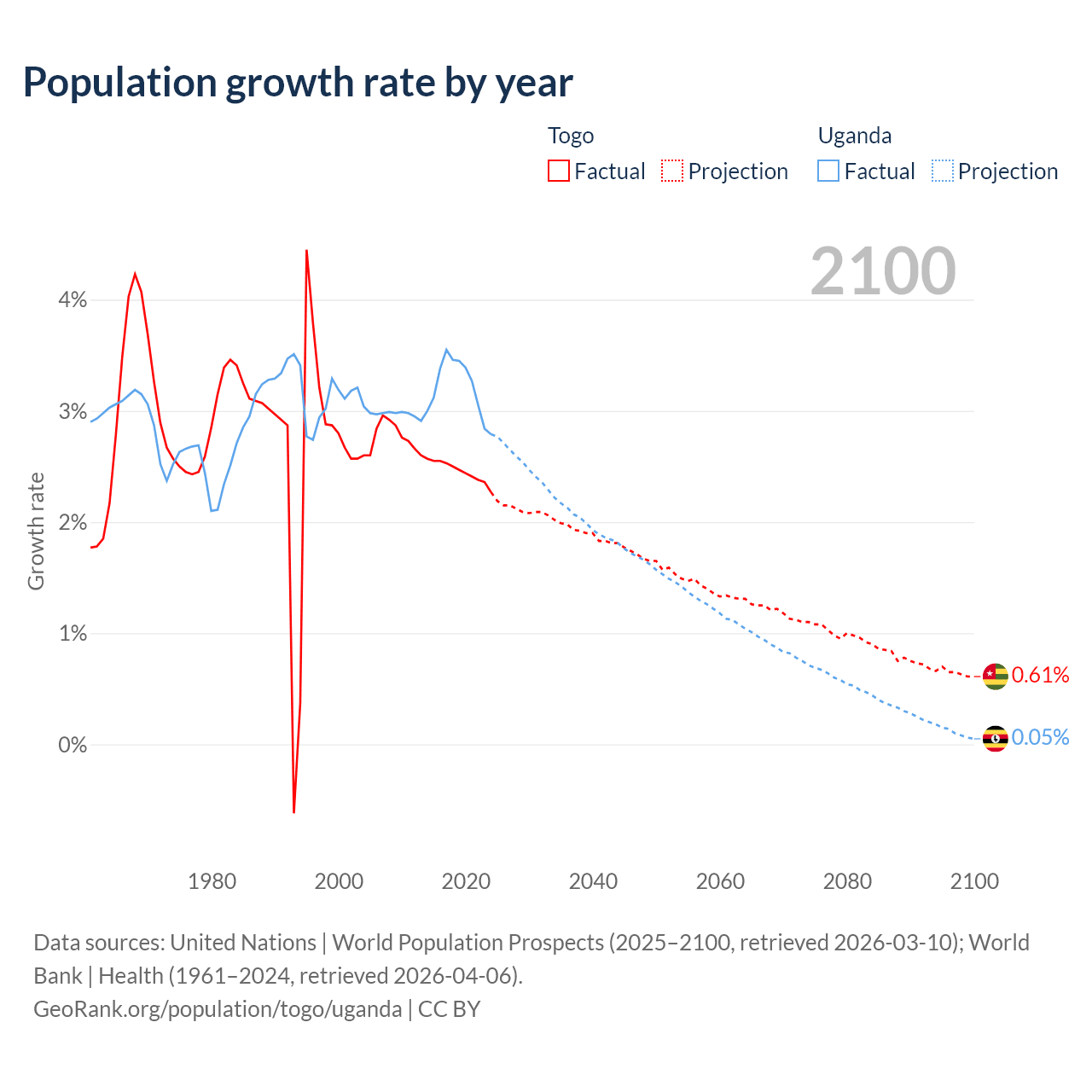 - For the last 10 years, Togo has had an average growth rate of +2.46% per year vs +3.21% in Uganda.