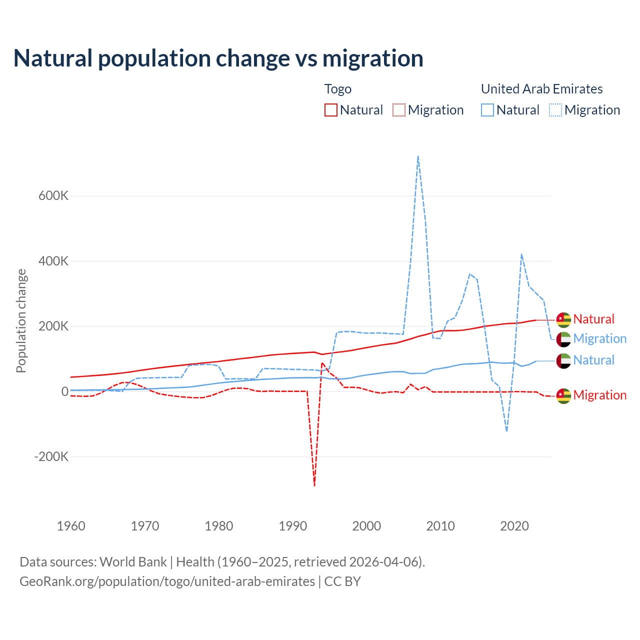 Over the last 10 years, 99.1% of the population change in Togo is from natural causes (a gain of 2,052,115 people) and 0.86% is from migration (a loss of 17,852 people). In the United Arab Emirates 30.5% is from natural causes (a gain of 857,996 people) and 69.5% is from migration (a gain of 1,958,520 people).