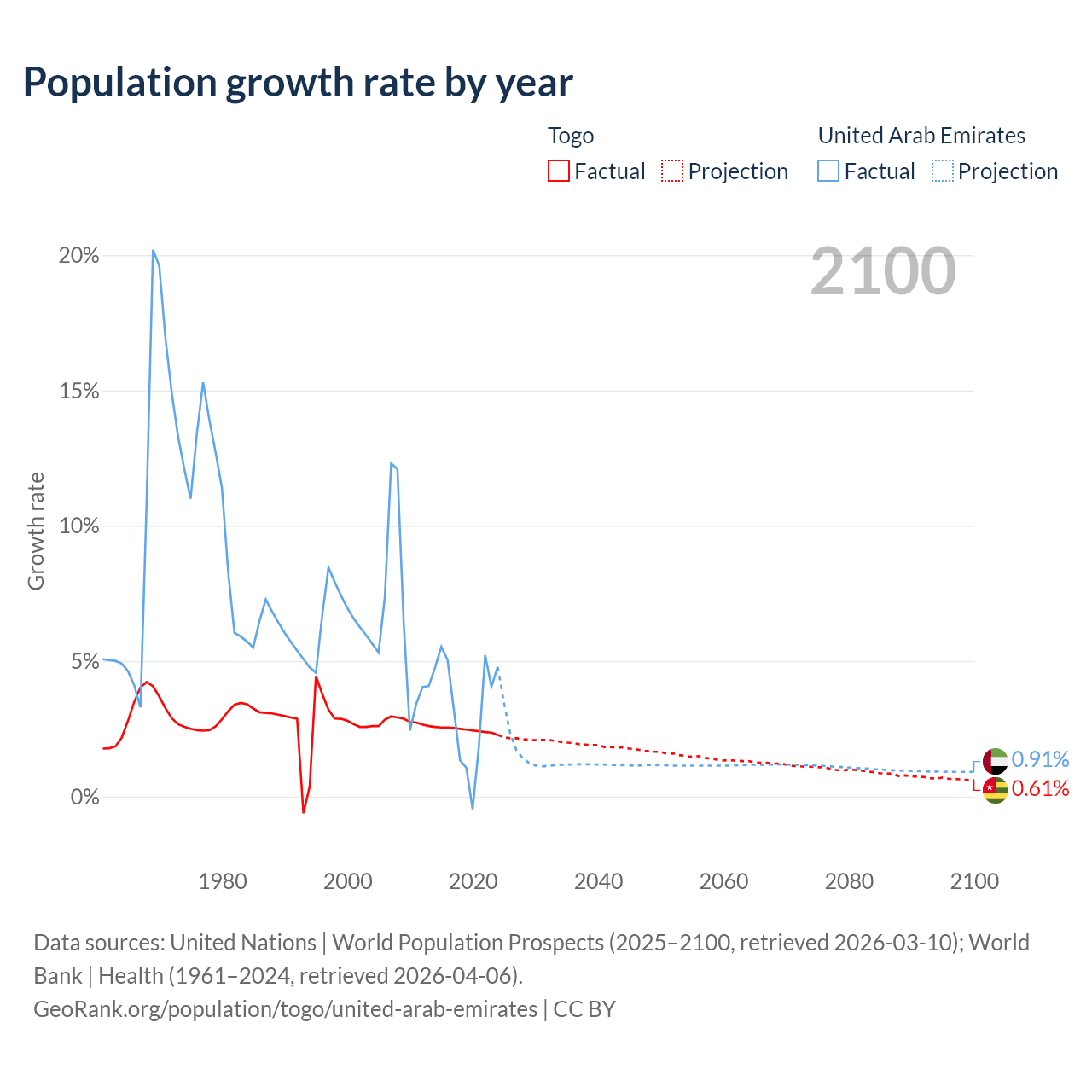 - For the last 10 years, Togo has had an average growth rate of +2.46% per year vs +3.31% in the United Arab Emirates.