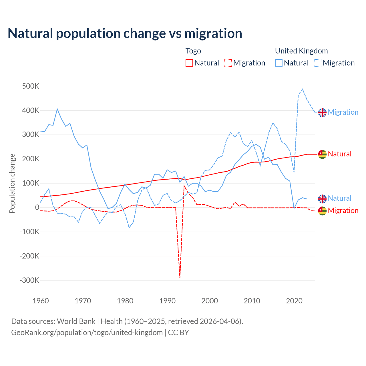Over the last 10 years, 99.1% of the population change in Togo is from natural causes (a gain of 2,052,115 people) and 0.86% is from migration (a loss of 17,852 people). In the United Kingdom 23.9% is from natural causes (a gain of 1,033,129 people) and 76.1% is from migration (a gain of 3,283,101 people).