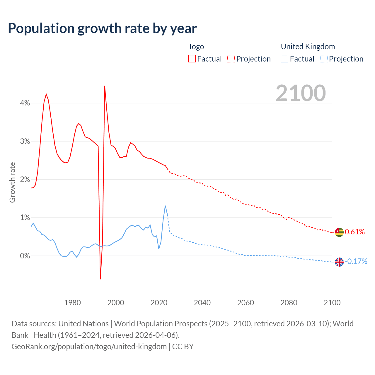 - For the last 10 years, Togo has had an average growth rate of +2.46% per year vs +0.7% in the United Kingdom.