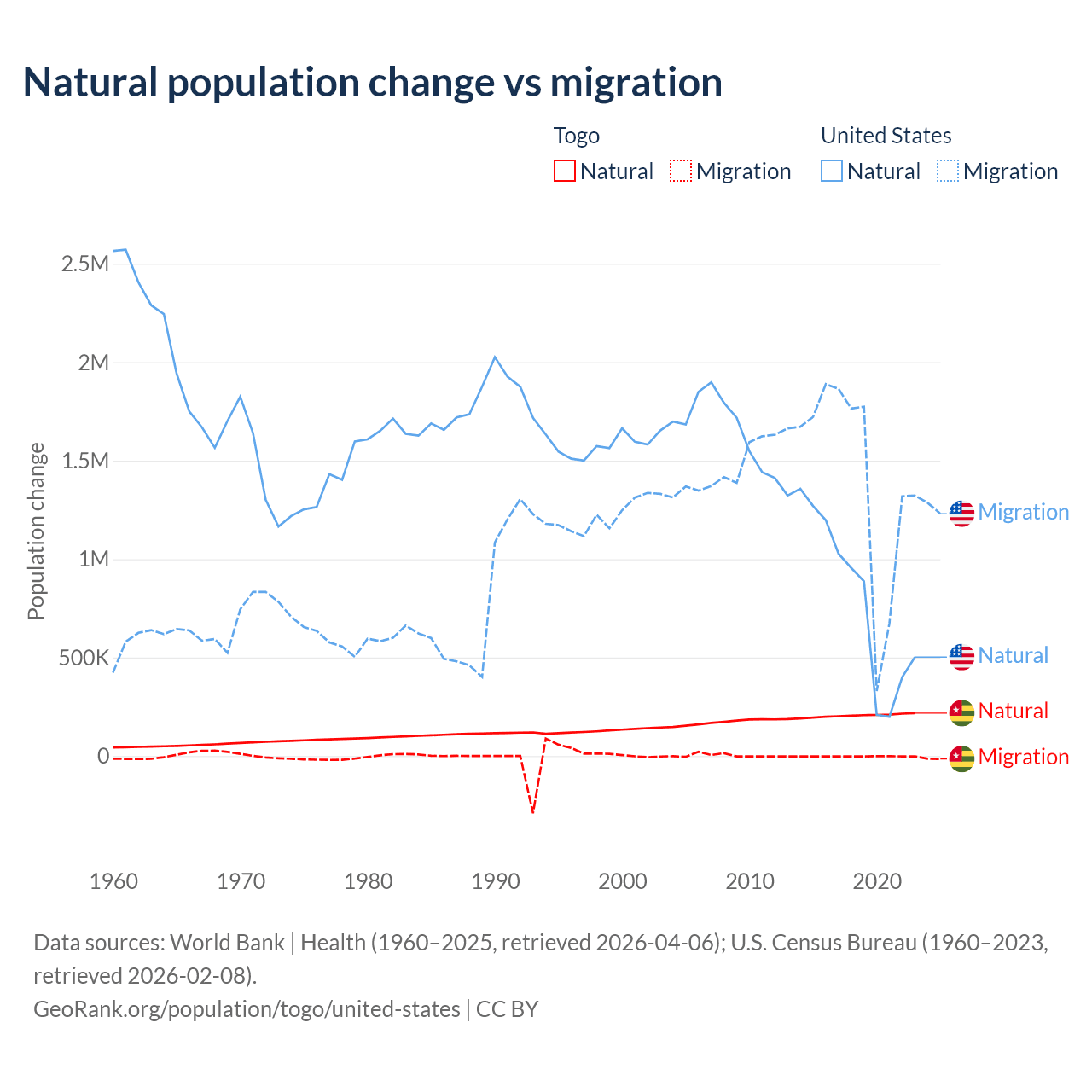 Over the last 10 years, 99.1% of the population change in Togo is from natural causes (a gain of 2,052,115 people) and 0.86% is from migration (a loss of 17,852 people). In the United States 35.8% is from natural causes (a gain of 8,005,866 people) and 64.2% is from migration (a gain of 14,334,286 people).