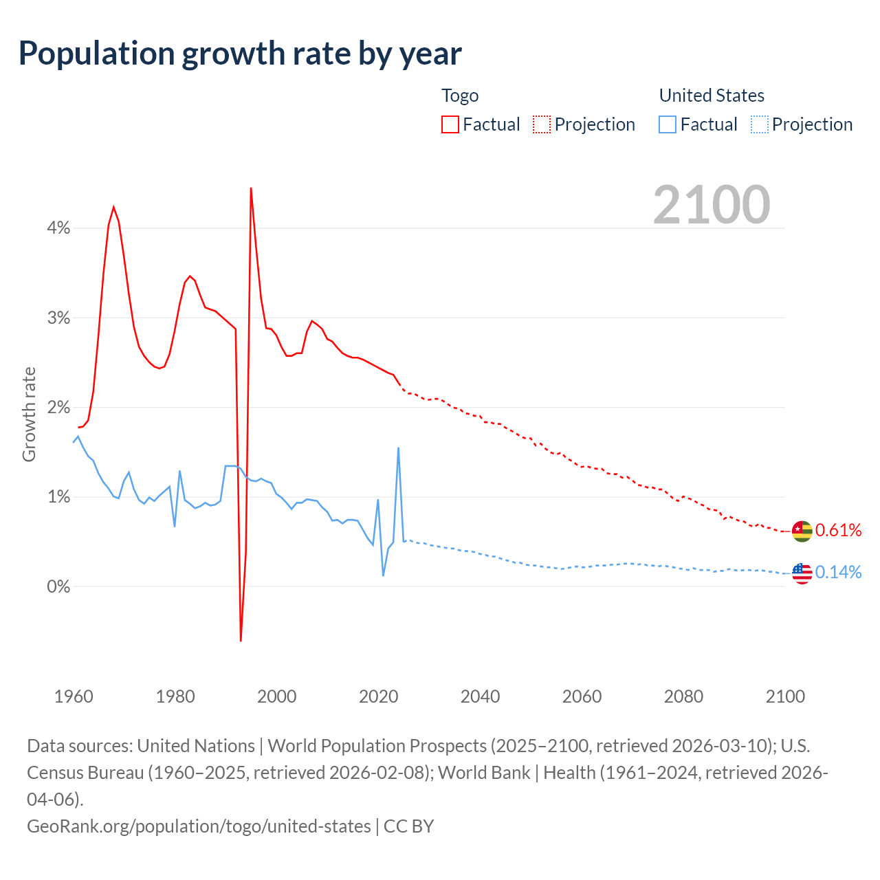 - For the last 10 years, Togo has had an average growth rate of +2.46% per year vs +0.65% in the United States.
