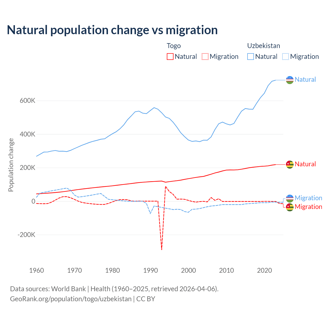 Over the last 10 years, 99.1% of the population change in Togo is from natural causes (a gain of 2,052,115 people) and 0.86% is from migration (a loss of 17,852 people). In Uzbekistan 98.2% is from natural causes (a gain of 6,161,117 people) and 1.84% is from migration (a loss of 115,398 people).