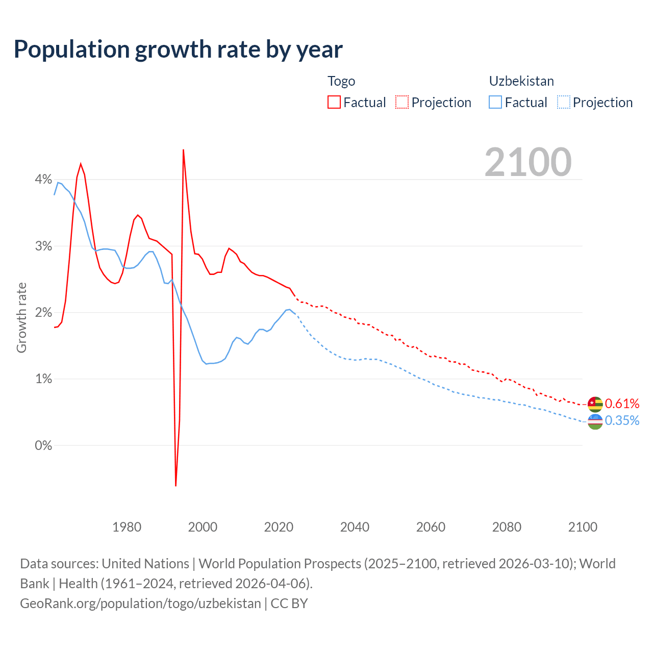 - For the last 10 years, Togo has had an average growth rate of +2.46% per year vs +1.85% in Uzbekistan.
