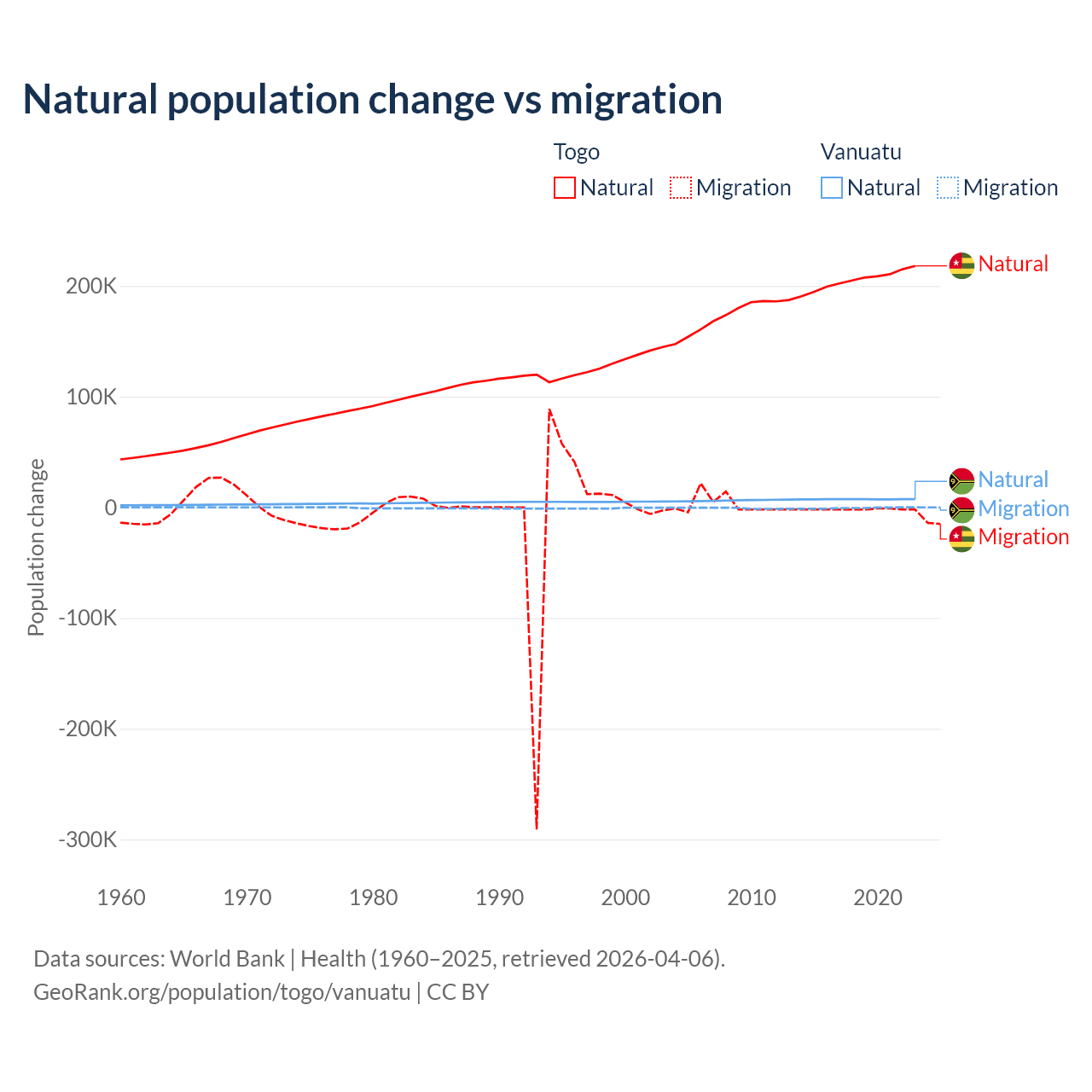 Over the last 10 years, 99.1% of the population change in Togo is from natural causes (a gain of 2,052,115 people) and 0.86% is from migration (a loss of 17,852 people). In Vanuatu 92.2% is from natural causes (a gain of 72,941 people) and 7.81% is from migration (a loss of 6,181 people).