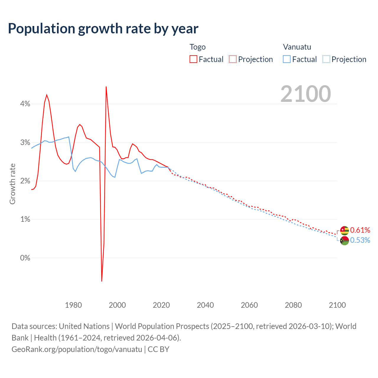 - For the last 10 years, Togo has had an average growth rate of +2.46% per year vs +2.33% in Vanuatu.
