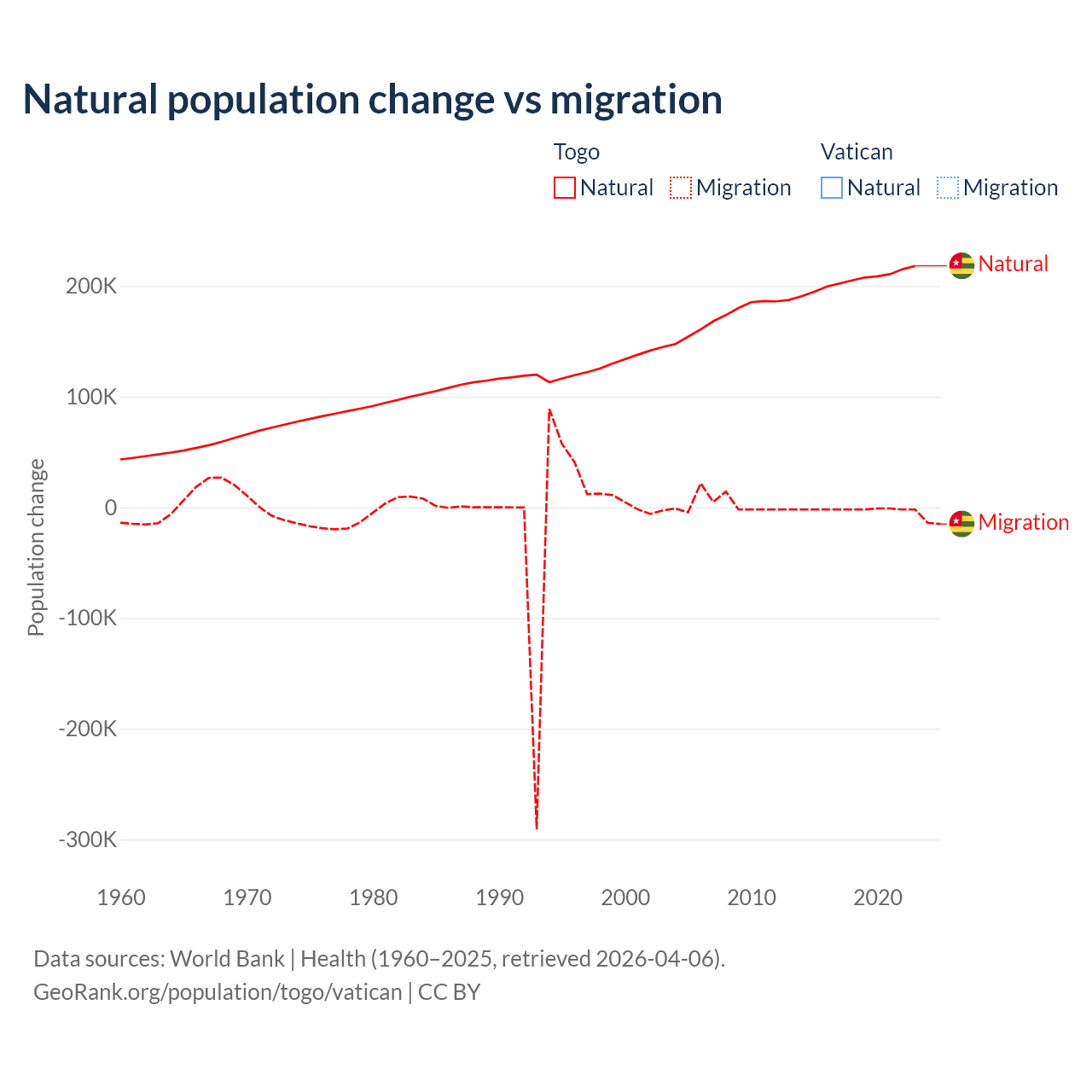- For the last 10 years, Togo has had an average growth rate of +2.46% per year vs +1.9% in the Vatican.