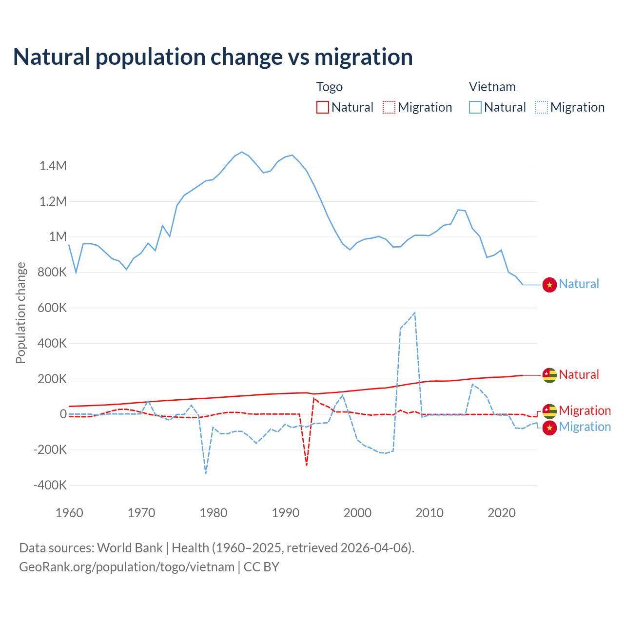 Over the last 10 years, 99.1% of the population change in Togo is from natural causes (a gain of 2,052,115 people) and 0.86% is from migration (a loss of 17,852 people). In Vietnam 97.7% is from natural causes (a gain of 9,349,756 people) and 2.29% is from migration (a gain of 219,073 people).