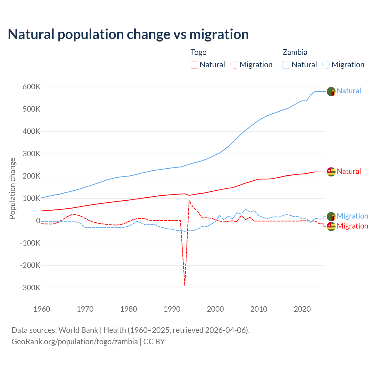 Over the last 10 years, 99.1% of the population change in Togo is from natural causes (a gain of 2,052,115 people) and 0.86% is from migration (a loss of 17,852 people). In Zambia 97.4% is from natural causes (a gain of 5,233,797 people) and 2.58% is from migration (a gain of 138,554 people).