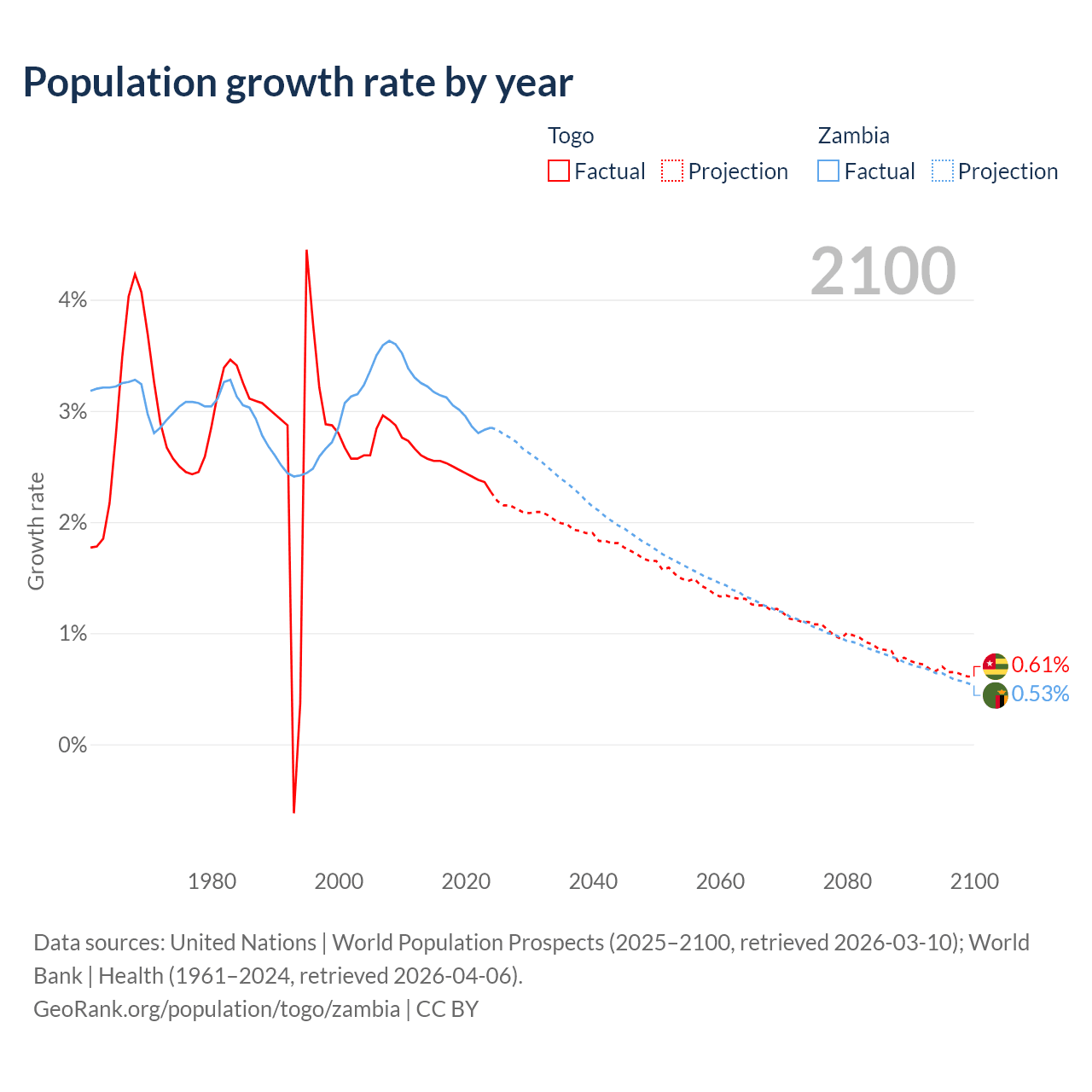 - For the last 10 years, Togo has had an average growth rate of +2.46% per year vs +3% in Zambia.