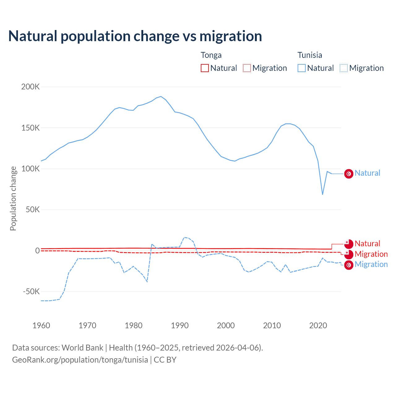 Over the last 10 years, 46.9% of the population change in Tonga is from natural causes (a gain of 18,919 people) and 53.1% is from migration (a loss of 21,384 people). In Tunisia 86.3% is from natural causes (a gain of 1,225,079 people) and 13.7% is from migration (a loss of 195,011 people).
