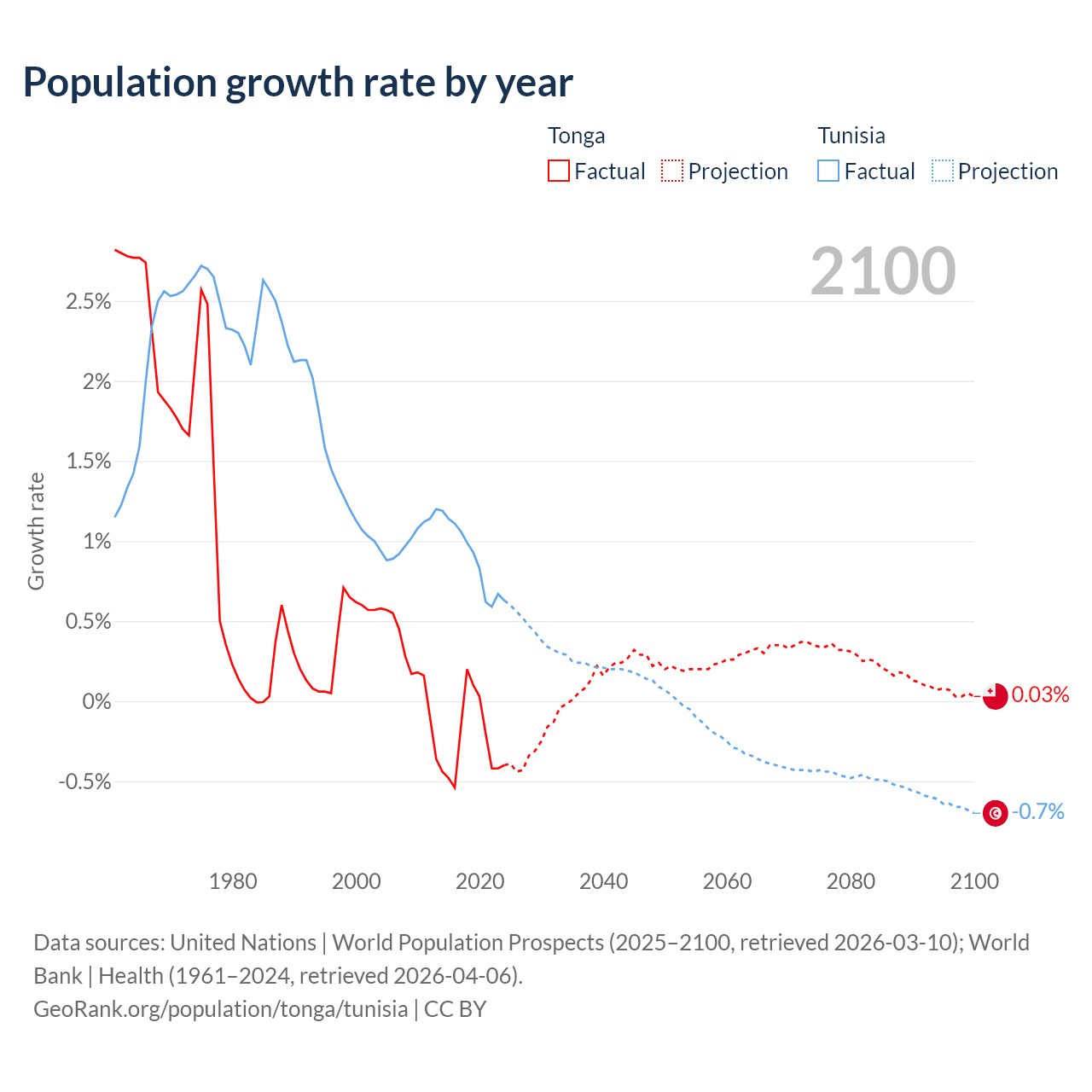 - For the last 10 years, Tonga has had an average growth rate of -0.25% per year vs +0.89% in Tunisia.