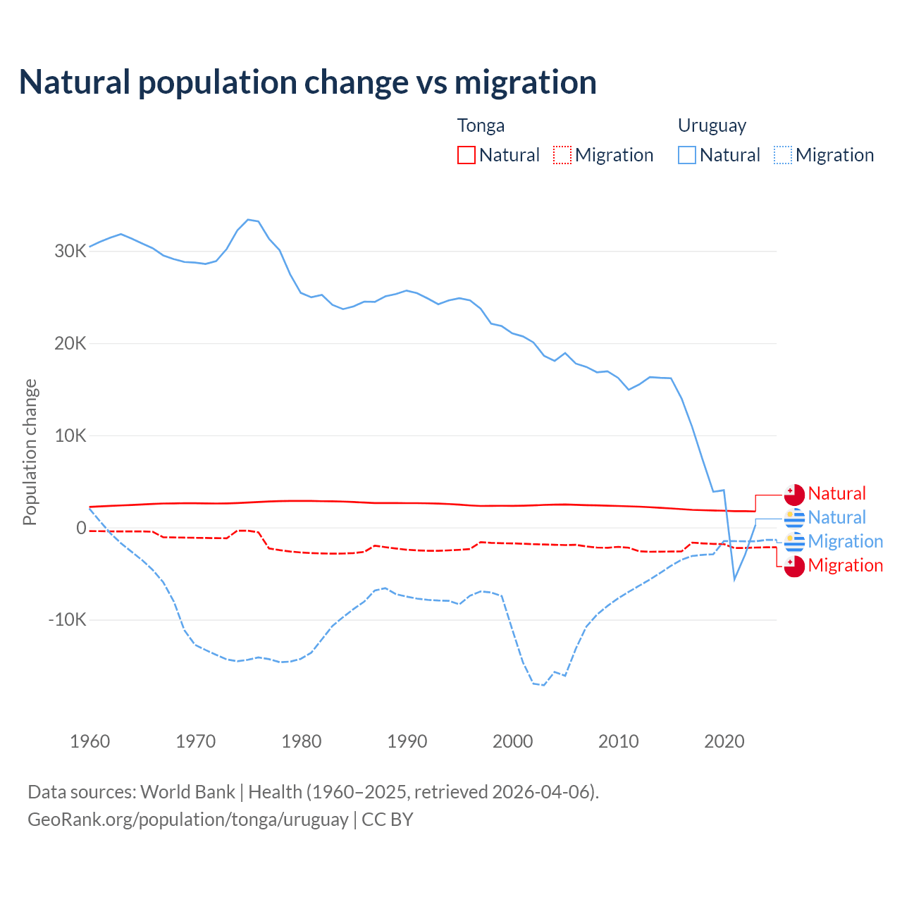 Over the last 10 years, 46.9% of the population change in Tonga is from natural causes (a gain of 18,919 people) and 53.1% is from migration (a loss of 21,384 people). In Uruguay 70% is from natural causes (a gain of 64,303 people) and 30% is from migration (a loss of 27,501 people).