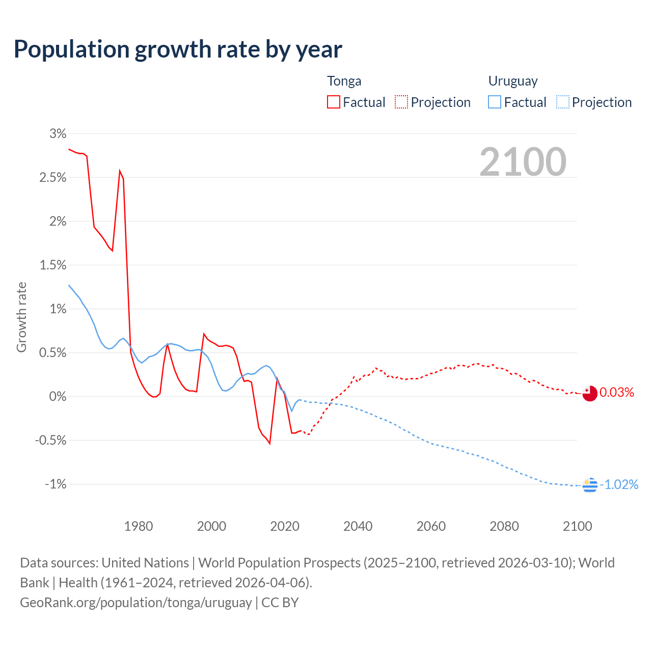 - For the last 10 years, Tonga has had an average growth rate of -0.25% per year vs +0.11% in Uruguay.