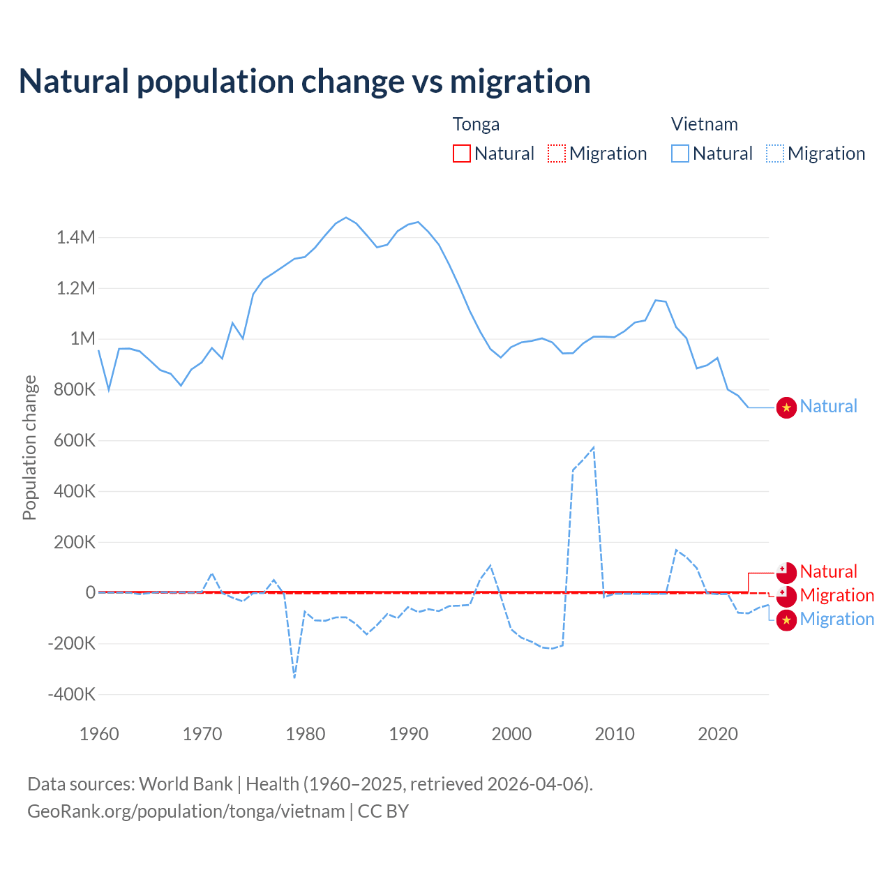 Over the last 10 years, 46.9% of the population change in Tonga is from natural causes (a gain of 18,919 people) and 53.1% is from migration (a loss of 21,384 people). In Vietnam 97.7% is from natural causes (a gain of 9,349,756 people) and 2.29% is from migration (a gain of 219,073 people).