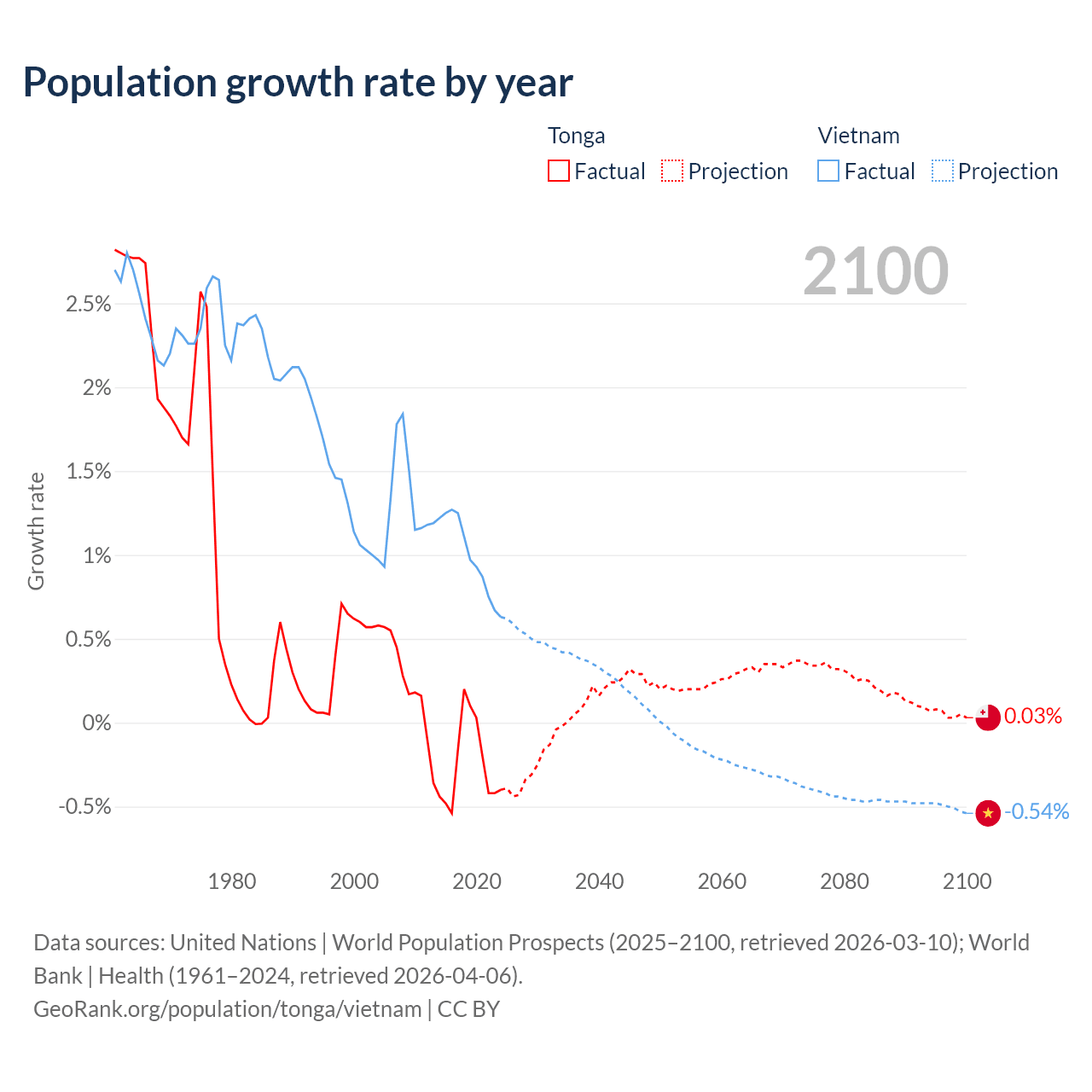 - For the last 10 years, Tonga has had an average growth rate of -0.25% per year vs +0.99% in Vietnam.