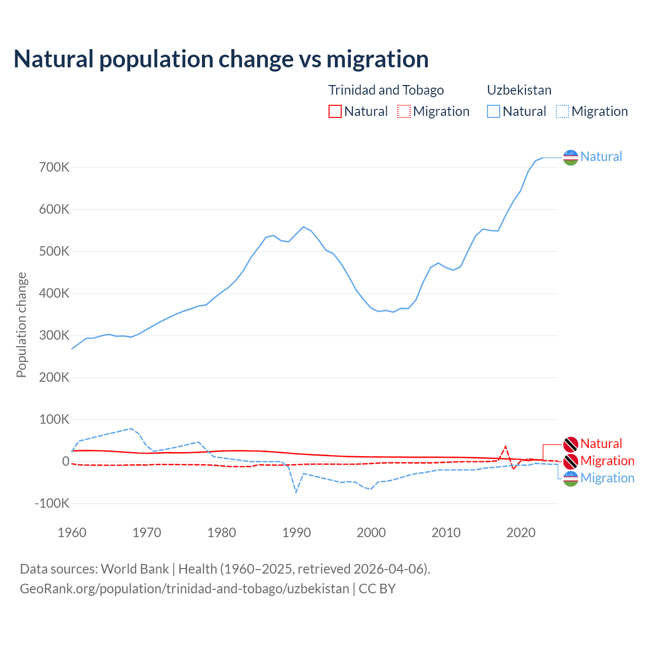 Over the last 10 years, 66% of the population change in Trinidad and Tobago is from natural causes (a gain of 55,887 people) and 34% is from migration (a gain of 28,785 people). In Uzbekistan 98.2% is from natural causes (a gain of 6,161,117 people) and 1.84% is from migration (a loss of 115,398 people).