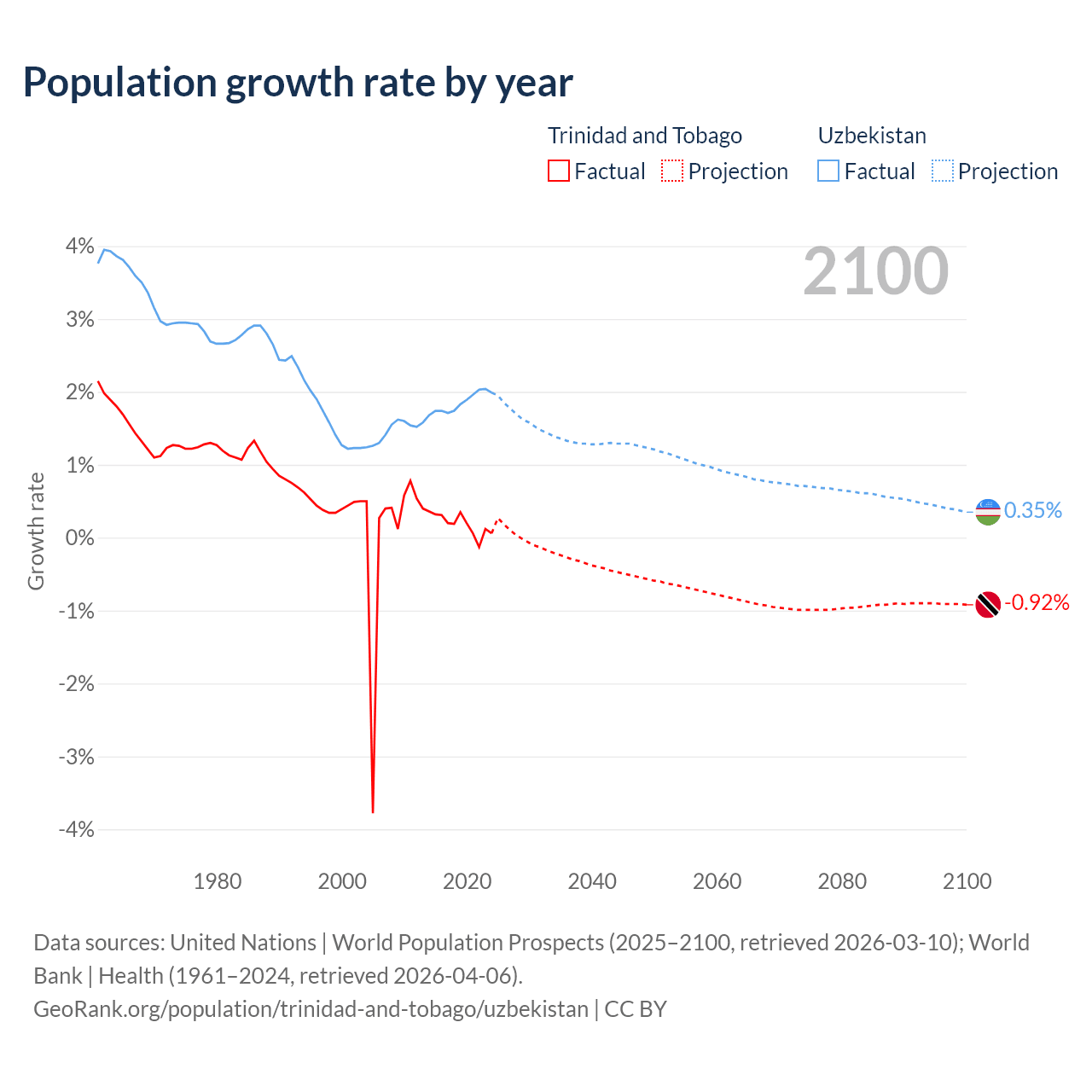 - For the last 10 years, Trinidad and Tobago has had an average growth rate of +0.19% per year vs +1.85% in Uzbekistan.