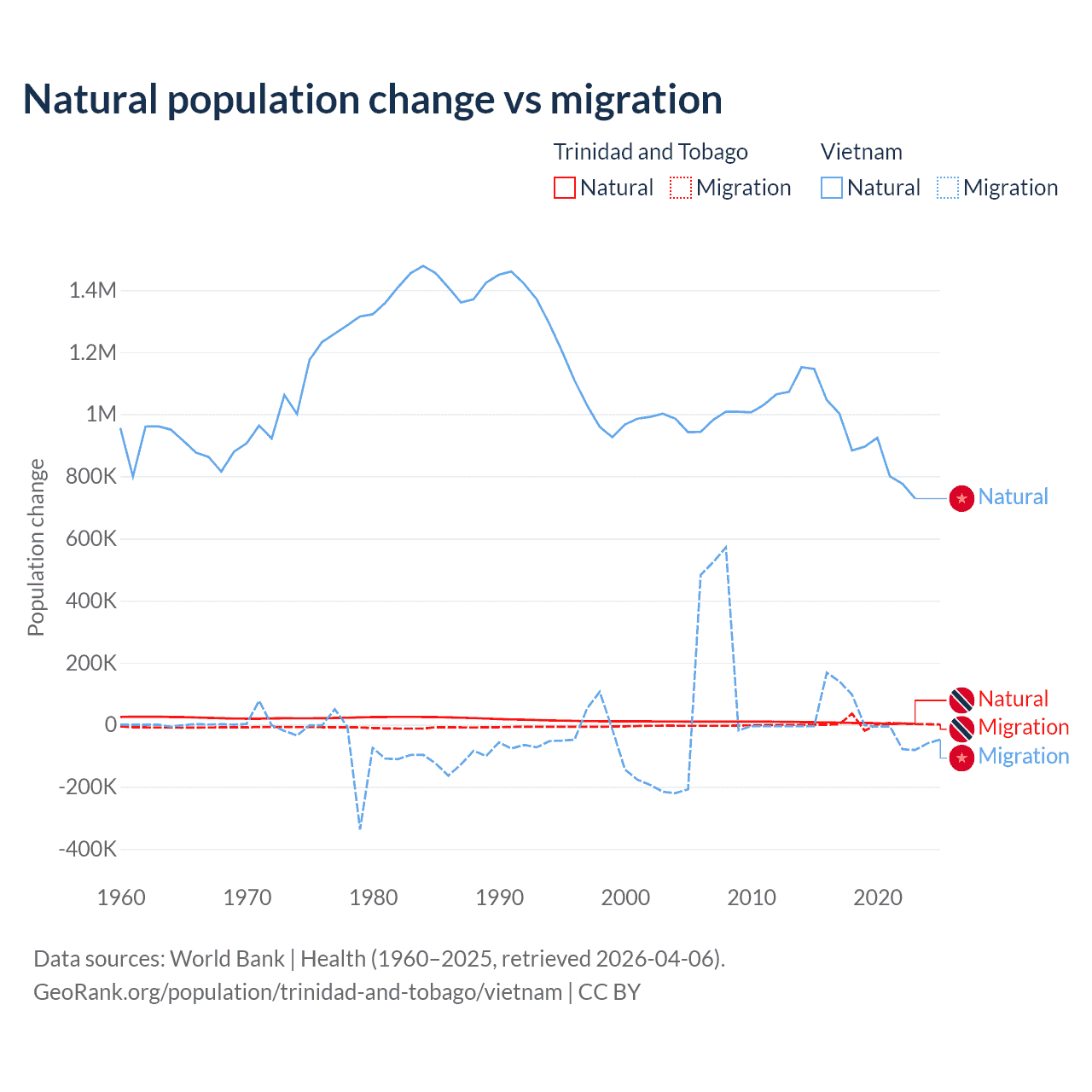 Over the last 10 years, 66% of the population change in Trinidad and Tobago is from natural causes (a gain of 55,887 people) and 34% is from migration (a gain of 28,785 people). In Vietnam 97.7% is from natural causes (a gain of 9,349,756 people) and 2.29% is from migration (a gain of 219,073 people).