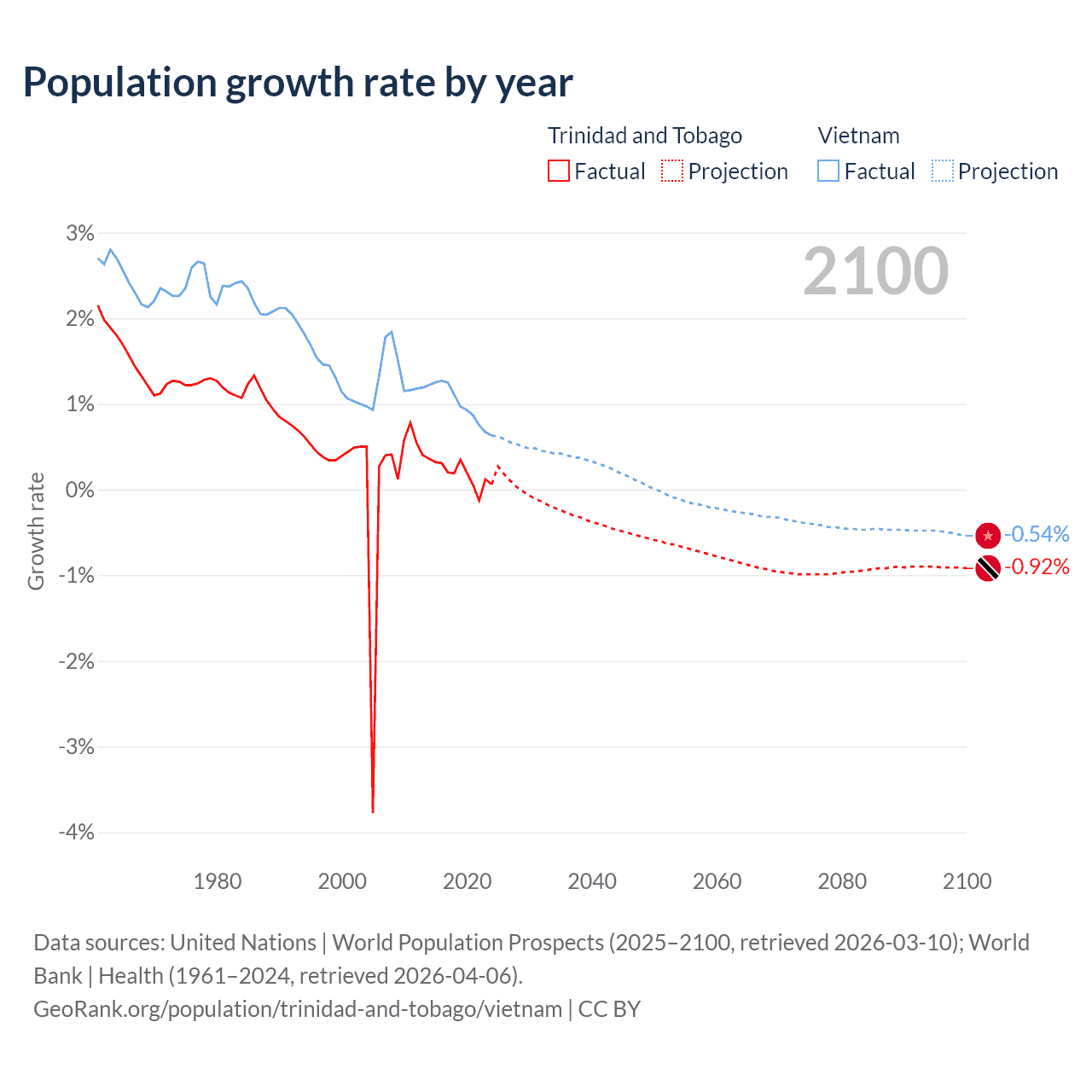 - For the last 10 years, Trinidad and Tobago has had an average growth rate of +0.19% per year vs +0.99% in Vietnam.