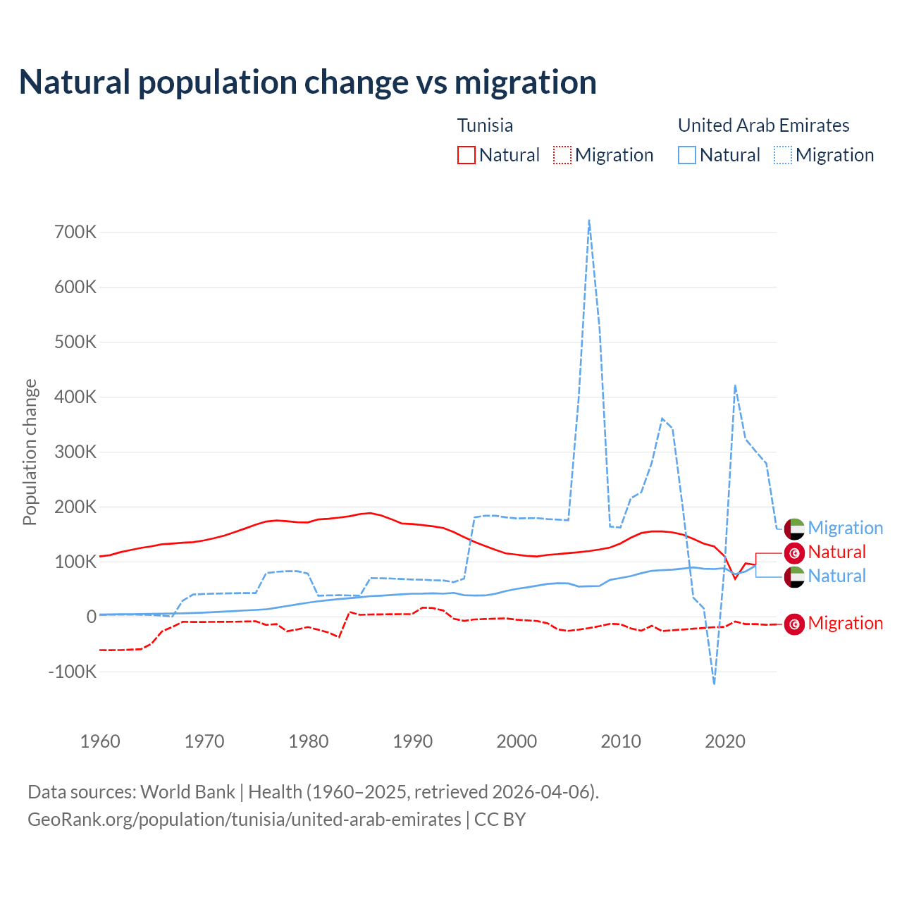 Over the last 10 years, 86.3% of the population change in Tunisia is from natural causes (a gain of 1,225,079 people) and 13.7% is from migration (a loss of 195,011 people). In the United Arab Emirates 30.5% is from natural causes (a gain of 857,996 people) and 69.5% is from migration (a gain of 1,958,520 people).