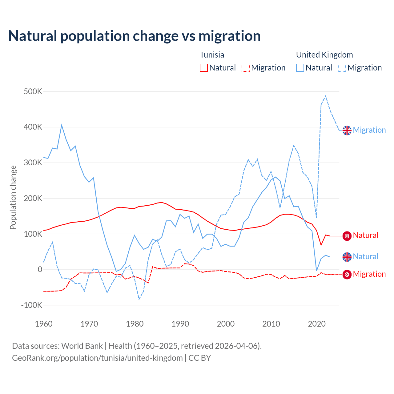 Over the last 10 years, 86.3% of the population change in Tunisia is from natural causes (a gain of 1,225,079 people) and 13.7% is from migration (a loss of 195,011 people). In the United Kingdom 23.9% is from natural causes (a gain of 1,033,129 people) and 76.1% is from migration (a gain of 3,283,101 people).