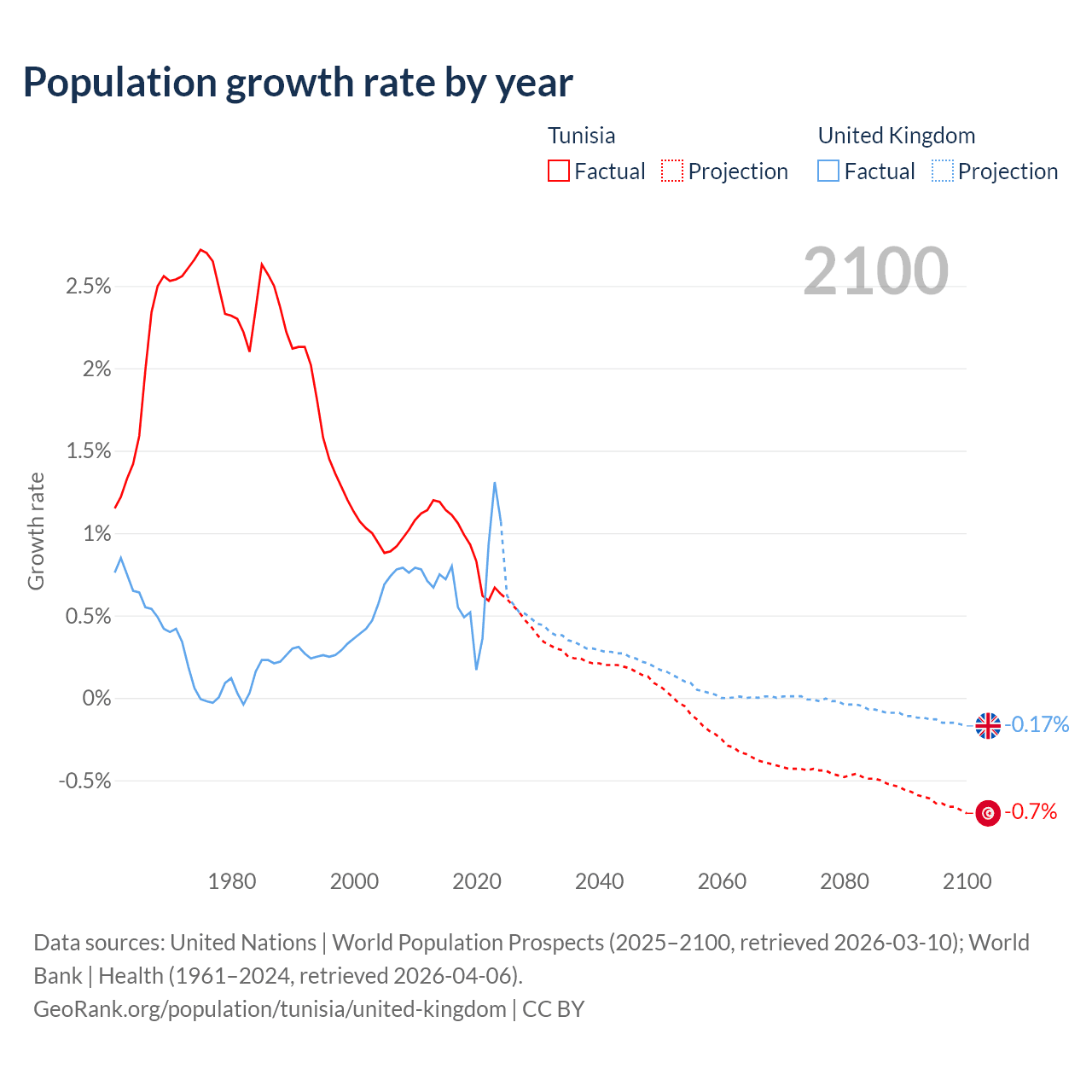 - For the last 10 years, Tunisia has had an average growth rate of +0.89% per year vs +0.7% in the United Kingdom.