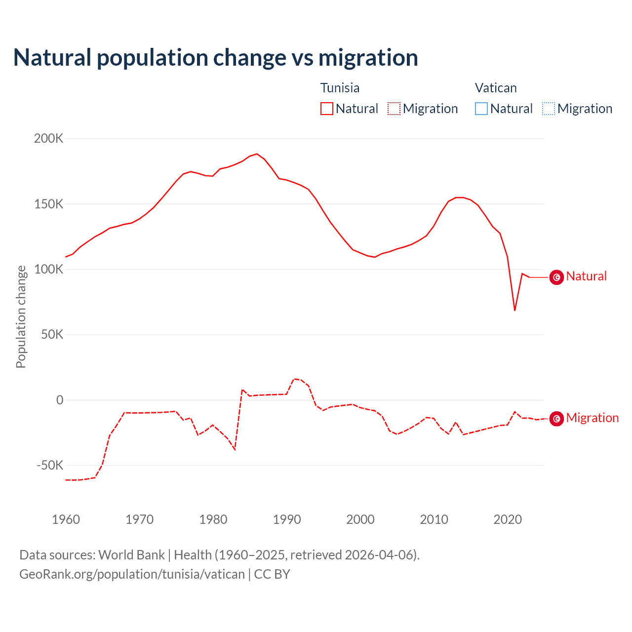 - For the last 10 years, Tunisia has had an average growth rate of +0.89% per year vs +1.9% in the Vatican.