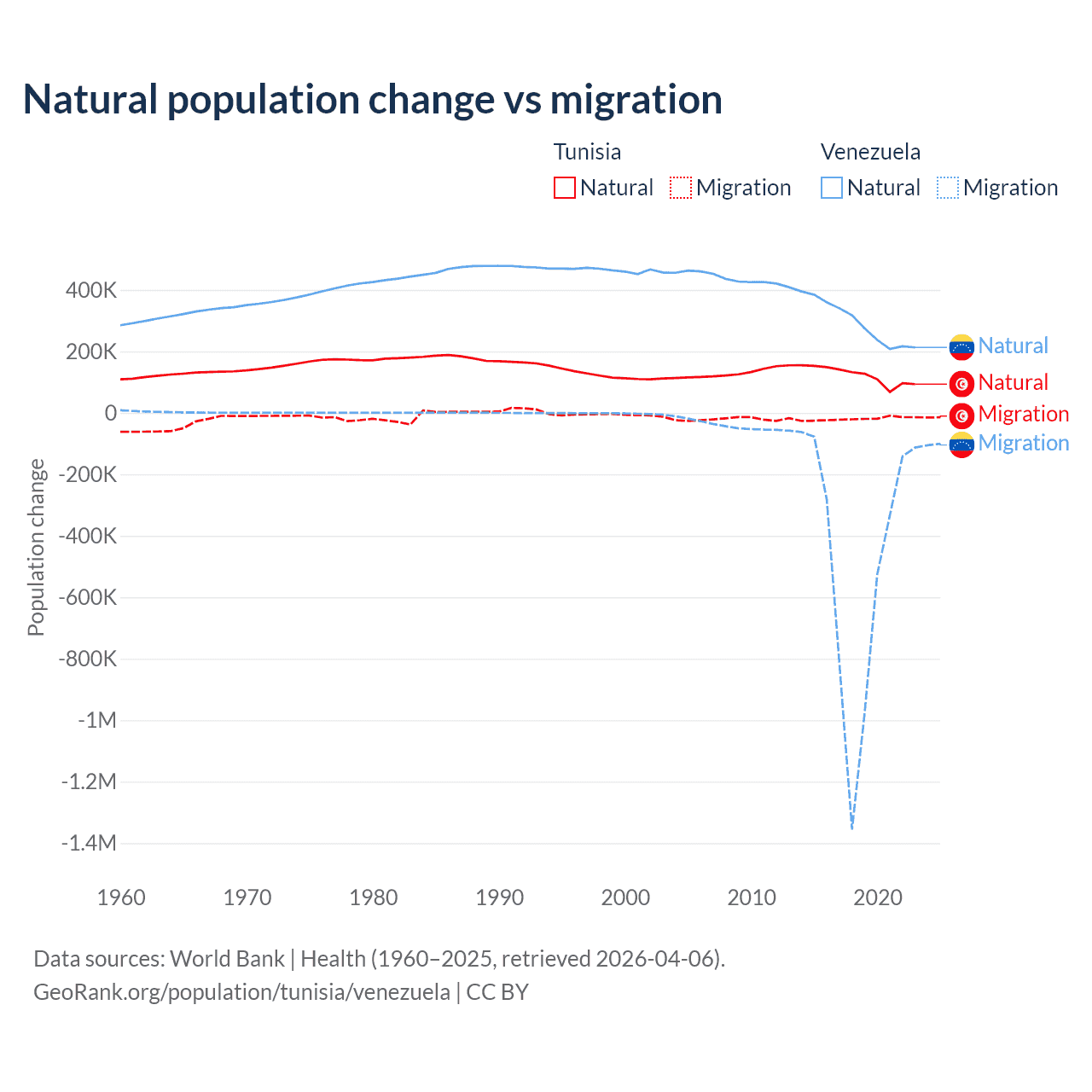 Over the last 10 years, 86.3% of the population change in Tunisia is from natural causes (a gain of 1,225,079 people) and 13.7% is from migration (a loss of 195,011 people). In Venezuela 38.6% is from natural causes (a gain of 2,946,257 people) and 61.4% is from migration (a loss of 4,683,227 people).